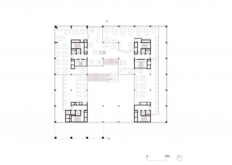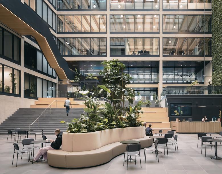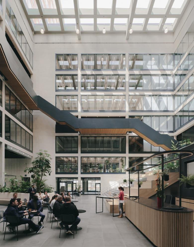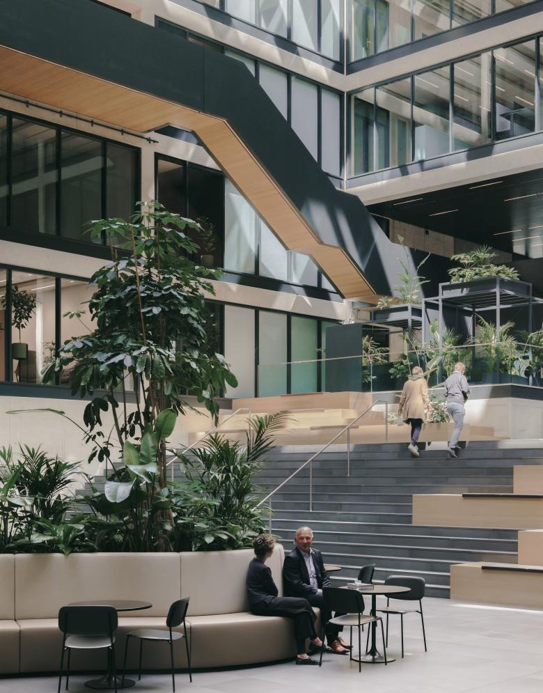 Im Westen der Hamburger HafenCity entwickelt sich aus ehemals industriell genutzten Hafenflächen ein vielfältiges neues Stadtviertel für Wohnen, Arbeiten und Freizeit. Mit dem EDGE HafenCity ist im Elbbrückenquartier nun ein weiterer wichtiger Baustein entstanden. Das energieeffizient geplante Bürogebäude fördert aktiv Interaktion und Kollaboration: Es bringt nicht nur die Menschen zusammen, die hier arbeiten, es öffnet sich auch Gästen und Menschen aus der Nachbarschaft. Der Neubau setzt sich aus zwei Gebäudeteilen zusammen – einem siebengeschossigen quadratischen Baukörper und einem Turm, der diesen mit einer Gesamthöhe von knapp 60 Metern im Südwesten überragt. Mit seinem quadratischen Gebäuderaster lässt sich das in einzelne Büroeinheiten unterteilte Gebäude flexibel nutzen. Zweigeschossige Arkaden und eine stützenfreie acht Meter weite Auskragung markieren den Haupteingang des Gebäudes am Amerigo- Vespucci-Platz. Kommunikatives Herzstück des Neubaus bildet ein zentrales Atrium, das auch für Gäste öffentlich zugänglich ist. Eine offene Treppe windet sich spiralförmig um den zentralen Luftraum und verbindet alle Geschosse miteinander. Auf jeder Ebene entstehen an der Treppe terrassenförmige Plateaus. Der Neubau schreibt so die Gestaltung des umgebenden Platzes mit Treppen und Terrassen im Inneren fort. Das Gebäude ist wie eine kleine Stadt konzipiert, die Raum für Begegnungen und Austausch, gemeinsame Lunch- und Kaffeepausen sowie individuelle Entspannung schafft. Im Erdgeschoss befinden sich Gastronomie- und Konferenzbereiche, in den Obergeschossen die mietbaren Büroflächen mit Zonen für kollaboratives und konzentriertes Arbeiten. Sie stehen allen Mieter*innen als gemeinsame Aufenthaltsbereiche zur Verfügung. Ebenso die umlaufende, üppig bepflanzte Dachterrasse, die der Erholung dient. Über das Atrium und die großformatigen Fenster fällt reichlich Tageslicht in die Innenräume. Es sorgt gemeinsam mit Pflanzen, natürlichen Materialien und vernetzten digitalen Technologien für eine komfortable Atmosphäre – zum Arbeiten und für ein soziales Miteinander. So wie sich das EDGE HafenCity mit seinem offenen und vielfältigen Konzept mit dem sozialen Umfeld vernetzt, fügt sich seine rote Fassade visuell in das städtebauliche Gefüge der östlichen HafenCity ein. Alle Dachflächen des Gebäudes sind als Retentionsdächer ausgebildet und größtenteils intensiv begrünt. Das Turmdach ist mit Photovoltaik-Paneelen zur Stromversorgung ausgestattet. Mit dem EDGE HafenCity ist ein Bürogebäude entstanden, das mit seiner innovativen Arbeitswelt Kollaboration und Kreativität fördert, und zu einem aktiven Baustein des sozialen Gefüges im neuen Elbbrückenquartier wird.