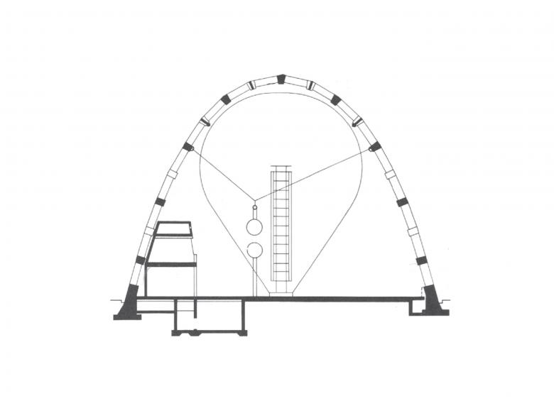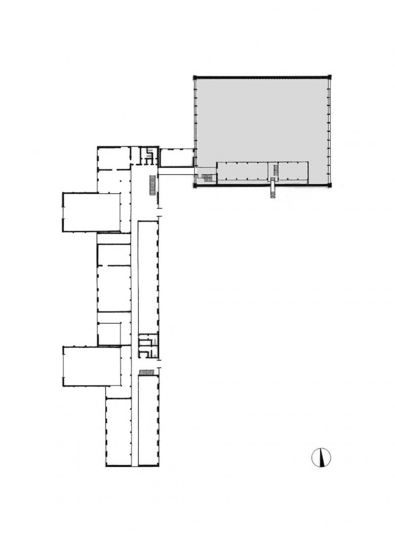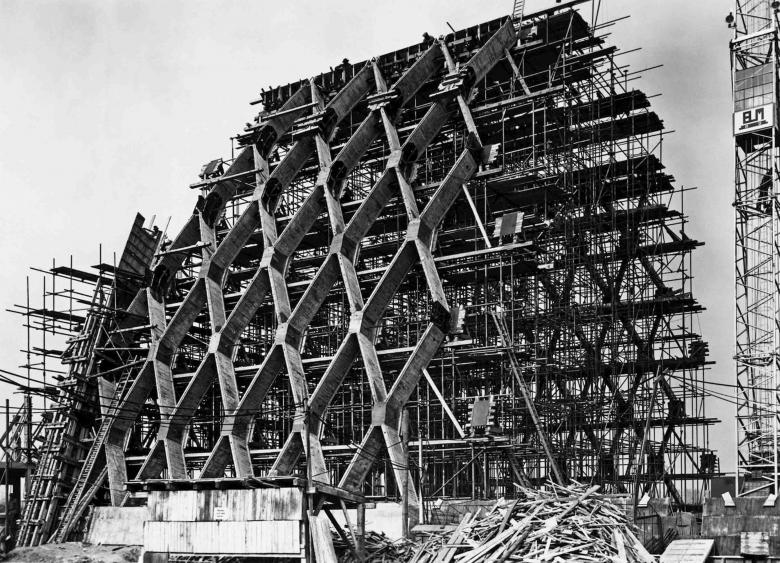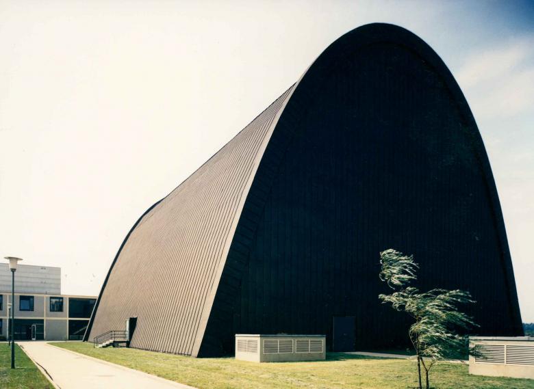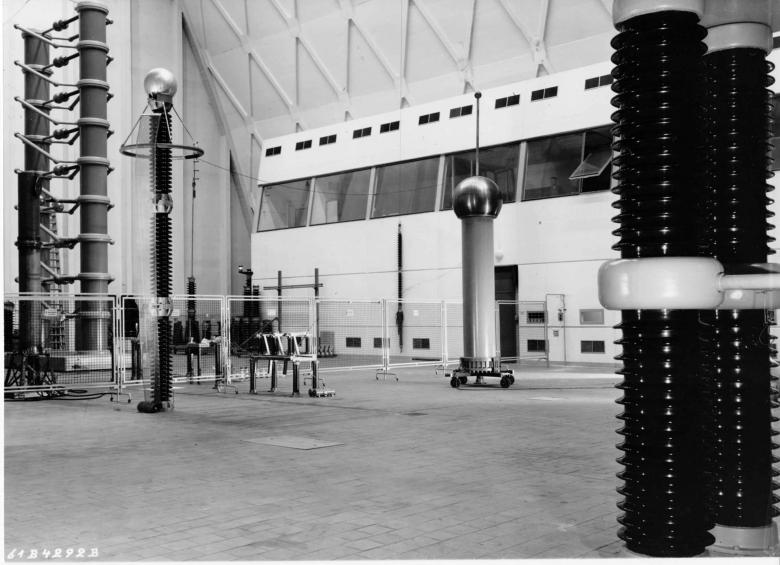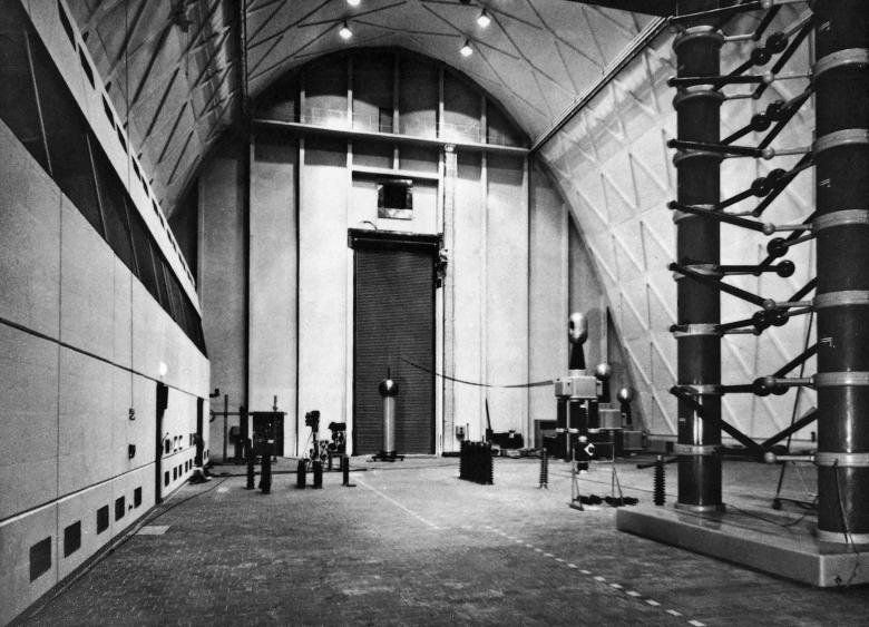Die große Hochspannungshalle, die – durch einen Zwischenbau verbunden – rechtwinklig an das Laborgebäude anschließt, stellte eine besondere Herausforderung dar. Ihre Form und Dimensionen wurden von dem Ausmaß des Spannungskreises bestimmt, wodurch ungenutzter Luftraum im oberen Drittel der Halle vermieden und zusätzliche Nutzfläche am Boden gewonnen werden konnte. Die Strukturierung des Gewölbes in ein Rautenfachwerk wurde mit der ausführenden Firma Beton- & Monierbau entwickelt. Es ermöglichte, die gesamte Halle im Wesentlichen aus nur zwei verschiedenen Stahlbeton-Fertigteilen herzustellen, nämlich aus T-förmigen Balken und aus dreieckförmigen Füllungsplatten. Besondere Aufmerksamkeit wurde der Frage der elektrischen Abschirmung zuteil. Walter Henn fertigte dafür eigens ein Versuchsmodell an, mithilfe dessen er die Bauabteilung des Bauherrn überzeugen konnte, die Halle vollständig in Kupfer ausführen zu lassen. Auf diese Weise konnte man eine aufwendige Auskleidung der Halle umgehen und die Dachhaut auch als Abschirmung nutzen. Bis heute überzeugt die Halle funktional, konstruktiv und ästhetisch und ist als Baudenkmal geschützt.