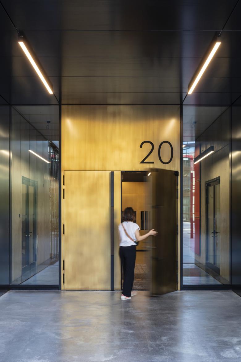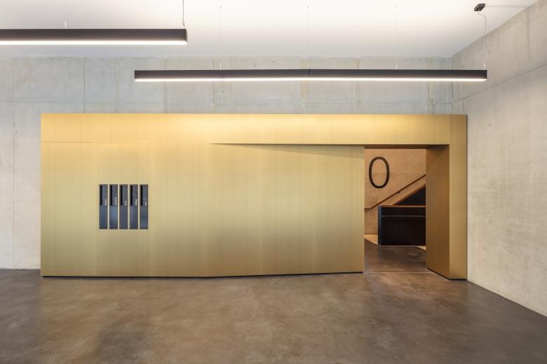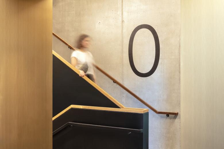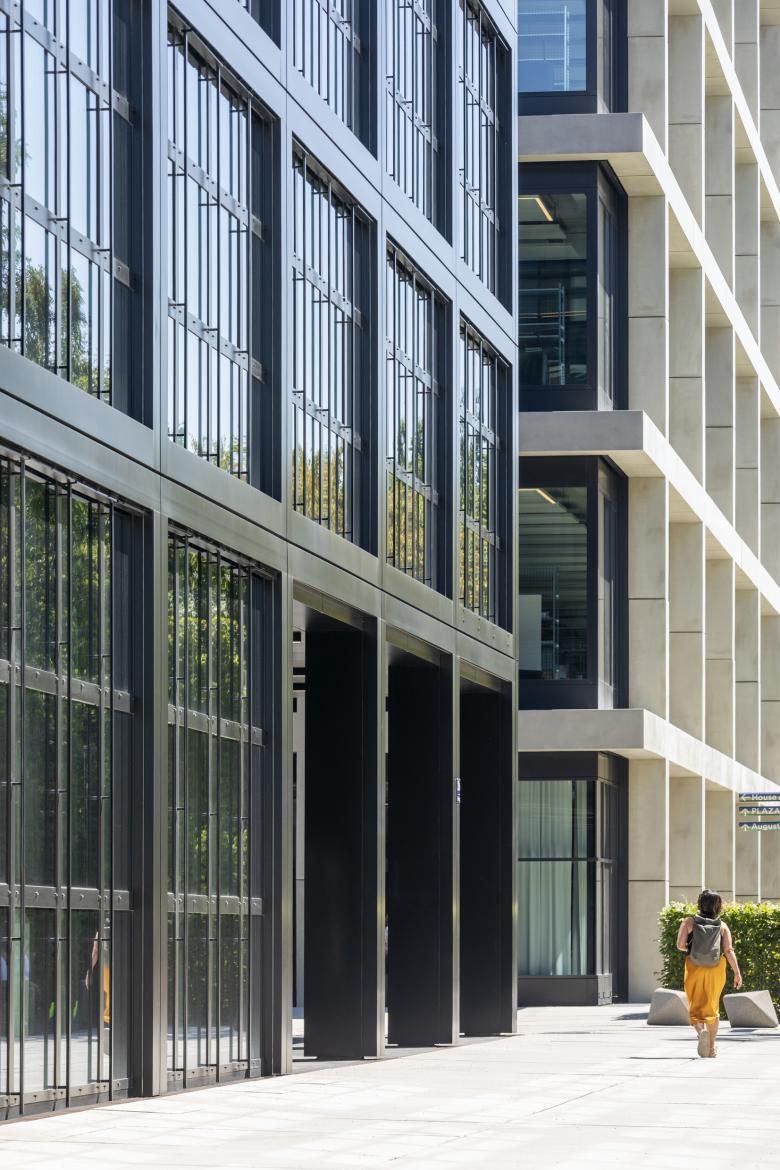 Vier Haupteingänge mit zur Campusplaza ausgerichteten Foyers führen in die Innenräume. Dort kontrastiert der grobe, unbehandelte Beton der Wände und Treppenhäuser mit dem warmen Messing der Briefkästen, das sich in Türen, Aufzügen und Teeküchen wiederfindet.