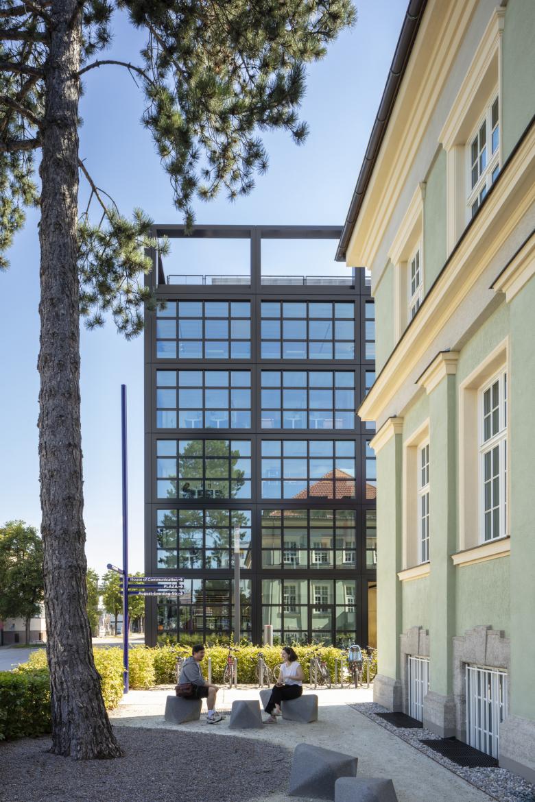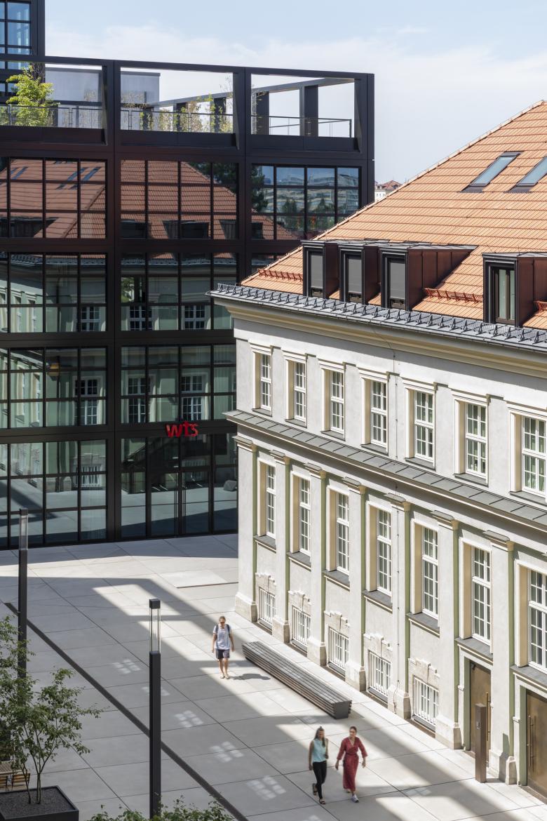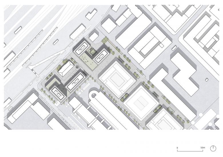 Das Ensemble fügt sich sensibel in den städtebaulichen Kontext ein. Die kleinteilige Bebauung entlang der Friedenstraße nimmt die Maßstäblichkeit der gegensätzlich erscheinenden neoklassizistischen Villa auf und schafft einen selbstverständlichen Übergang zur weiteren Bebauung des iCampus und dem gesamten umgebenden Werksviertel. Offene Pergolen auf den Dächern vermitteln zwischen dem flachen Gelände zum Bahnhof hin und den ansteigenden Höhen der vier- bis sechsgeschossigen Bürobauten in Richtung Campuszentrum. Um die Perspektive auf die Villa zu öffnen und einladende Wege ins Innere zu gestalten, ist das Gebäude an der Friedenstraße etwas zurückversetzt.