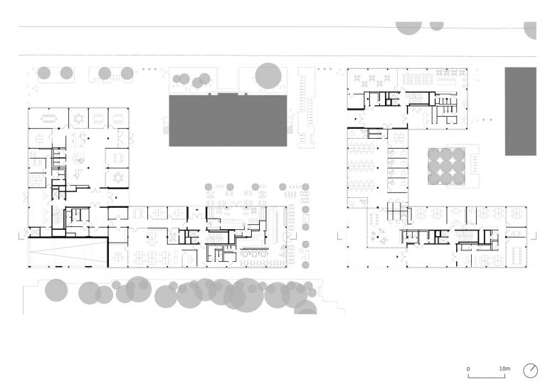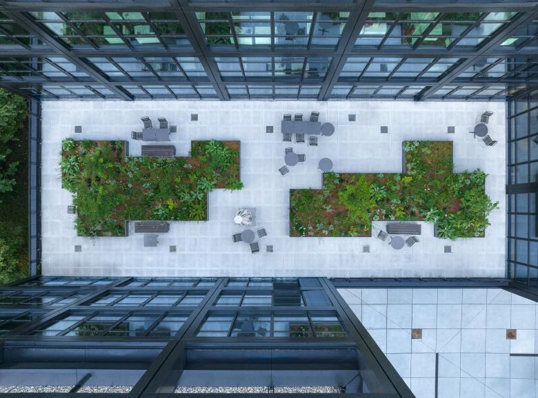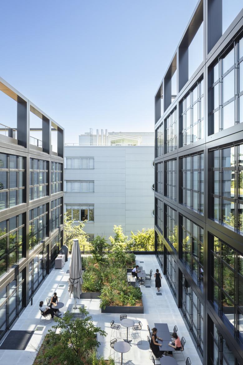 Dem Community-Gedanken folgend ist die Campusplaza im Zentrum des Ensembles wie ein „Urban Village“ gestaltet. Außensitzplätze verschiedener Restaurants und Cafés, lange Holzbänke unter Bäumen und begrünte Dachterrassen schaffen einen Ort, an dem man gern arbeitet und seine Freizeit verbringt.