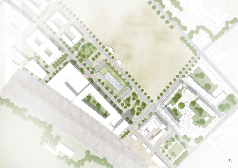 Der Campus West verbindet zwei bestehende Universitätsstandorte: den Campus Mitte und den Standort Melaten. Über die nächsten Jahrzehnte wird das langgestreckte, brachliegende Areal kontinuierlich entwickelt. Das neue Institut befindet sich an dessen Eingang, am Beginn des Campusbands, einer verkehrsberuhigten Achse, entlang derer sich künftig weitere Universitätsgebäude aufreihen.