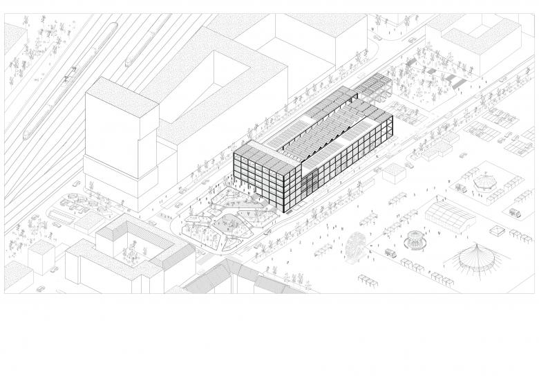 Auf dem höchsten Baukörper in Richtung Kongressplatz öffnet sich der Raum hinter der überhöhten Fassade zu einer großzügigen, begrünten Dachterrasse, die der Erholung der Studierenden und Forschenden dient.