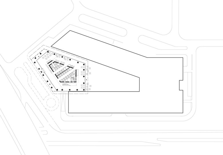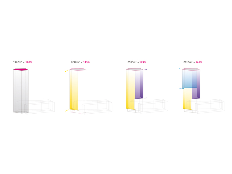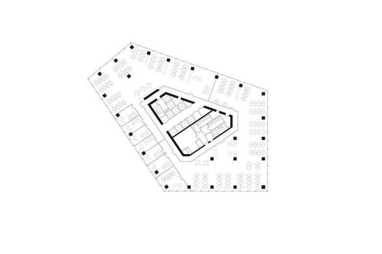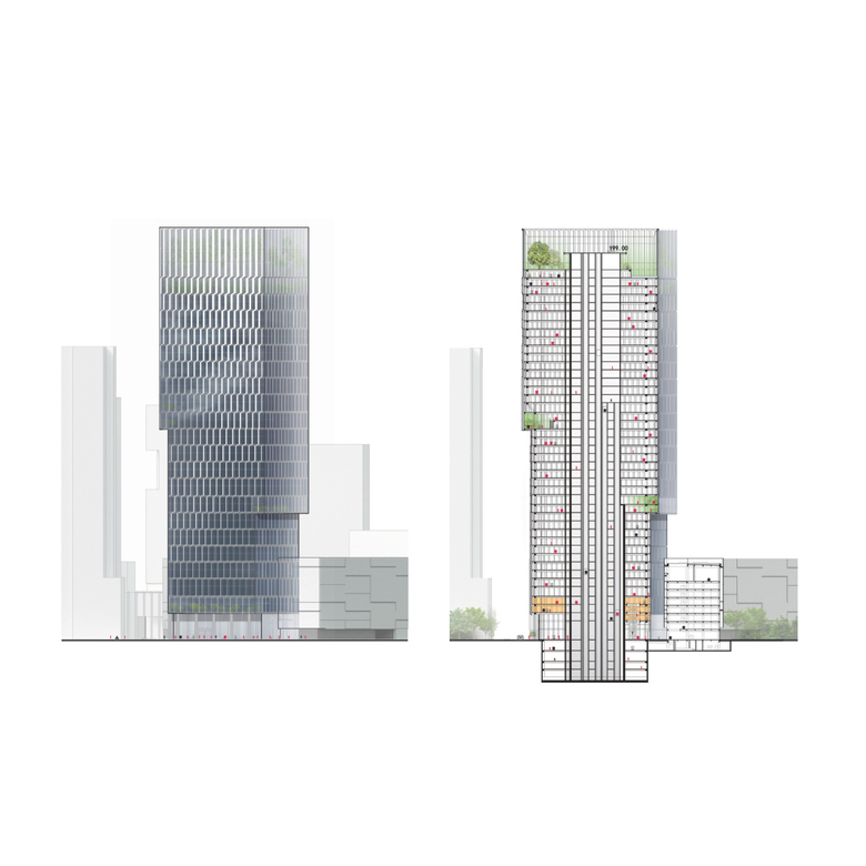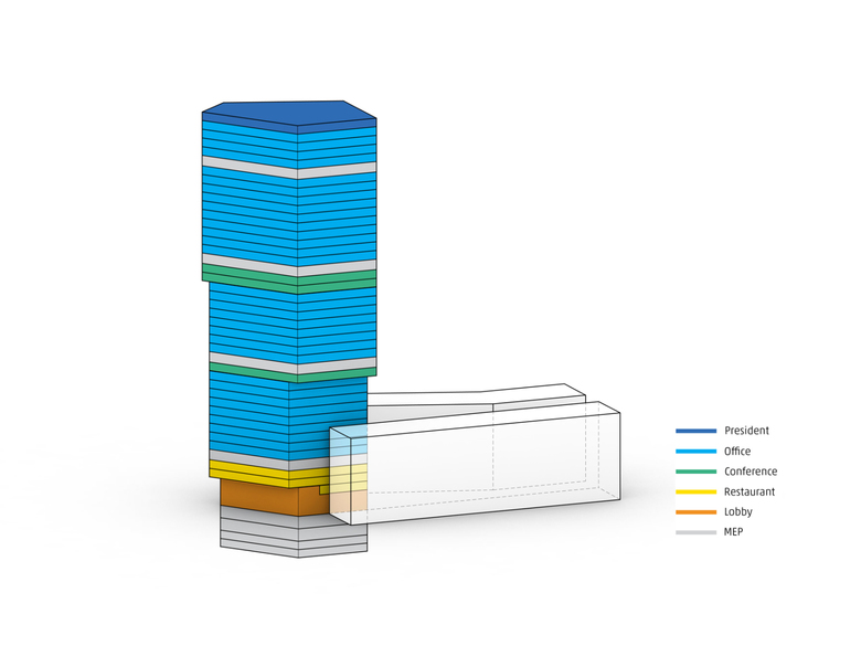 Der verglaste Turm bildet den zentralen Kopfbau für den Unternehmenssitz. Durch die exponierte Lage und seine Höhe von 44 Geschossen hat das Gebäude eine Signalwirkung als städtebauliches Landmark. Seine unregelmäßige fünfeckige Gebäudegrundfläche ergibt sich aus der optimalen Flächennutzung zwischen zwei neungeschossigen Bestandgebäuden. Das Hochhaus kragt in drei unterschiedlichen Höhen aus und erhält so eine skulpturale Anmutung. Gleichzeitig erweitern die Vorsprünge die Geschossflächen der Konferenzebenen auf verschiedene Seiten. Durch seine facetten- reiche geometrische Form fügt sich der Neubau in das bestehende Ensemble aus Bürogebäuden ein. Das dreigeschossige Atrium des Turms ist durchgängig verglast und als offenes Entree konzipiert. Be- sucher und Mitarbeiter werden in einem offenen und repräsentativen Foyer empfangen, das auch im Außenraum Wirkung zeigt. Die Aufzüge im zentralen Erschließungskern führen in die einzelnen Eta- gen und deren flexibel nutzbare Büroflächen. Das Stützenraster des Turms sowie sein Stahlbetonkern, der sich an der fünfeckigen Grundform orientiert, bilden ein effektives Tragwerk. Unter den Konferenzetagen an den Auskragungen befinden sich jeweils Technikgeschosse, in denen das Raster der Stützen verspringt. Die Fassadengestaltung des Hochhauses erzeugt ein optimales Verhältnis zwischen Ausblick und Verschattung. Dabei reagieren die Struktur und der Transparenzgrad der Außenhülle jeweils auf die Sonneneinstrahlung und das konkrete Raumprogramm. Die öffentlichen Bereiche auf der Höhe der charakteristischen Vorsprünge des Gebäudes erhalten durch plane Fensterflächen maximale Transparenz und freie Aussicht. Die Faltung sowie der Anteil geschlossener Fassadenelemente in den Büroetagen reagieren auf die Sonneneinstrahlung und verschatten die Innenräume. So werden die Büroflächen entsprechend den Herausforderungen des tropischen Klimas in der Metropole ange- messen vor der Sonne geschützt.