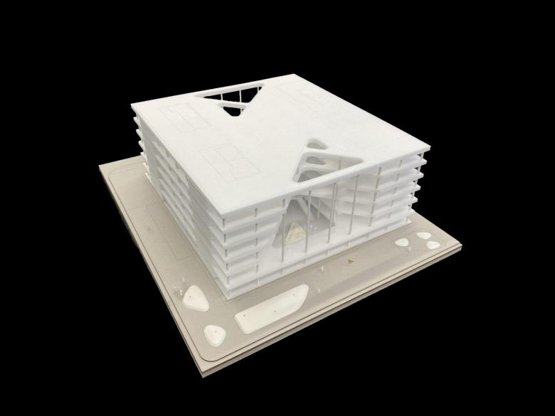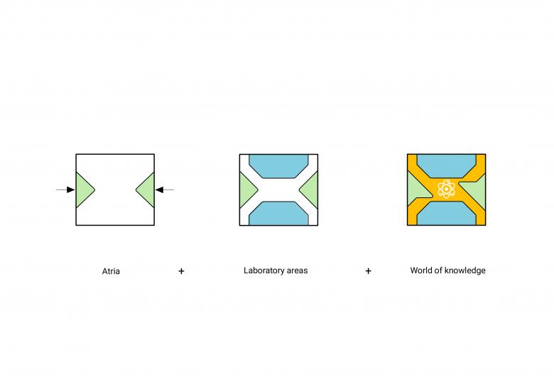 Der kompakte Kubus öffnet sich sowohl zum Campus als auch zur Stadt hin durch zwei tief eingeschnittene Atrien, die von gestaffelten, auskragenden Ebenen der oberen Geschosse umschlossen werden. Durch die gläsernen Decken der Atrien fällt Tageslicht bis in die Gebäudemitte. Verschiedene Pflanzenarten, die im benachbarten Odenwald heimisch sind, darunter bis zu neun Meter hohe Bäume, werden mitsamt Erdreich in das Gebäude integriert und verwandeln die Atrien in Orte der Erholung. Die verglaste Fassade öffnet ihre vorgesetzte Lamellenstruktur vor den Atrien und gibt so den Blick ins Innere frei. In einem Schaulabor im Erdgeschoss, dem Technikum, gibt Merck einen Einblick in die Forschungsarbeit.
