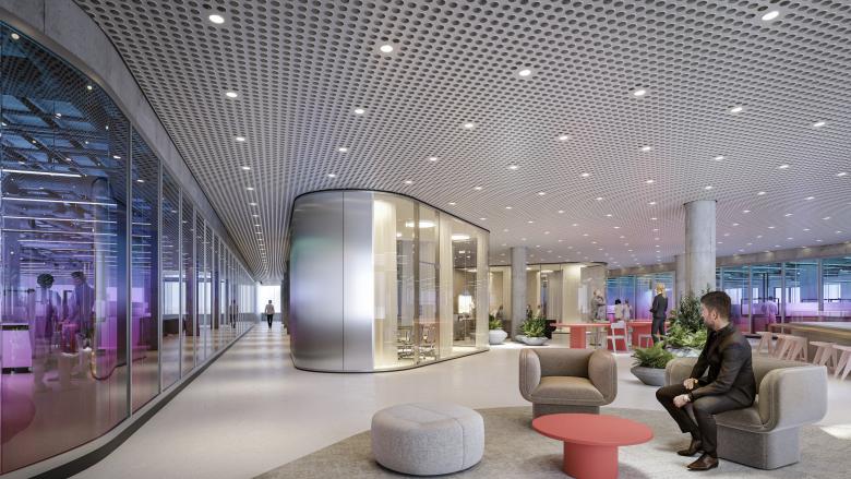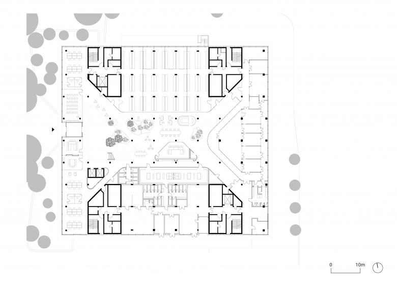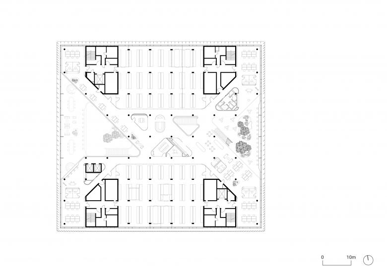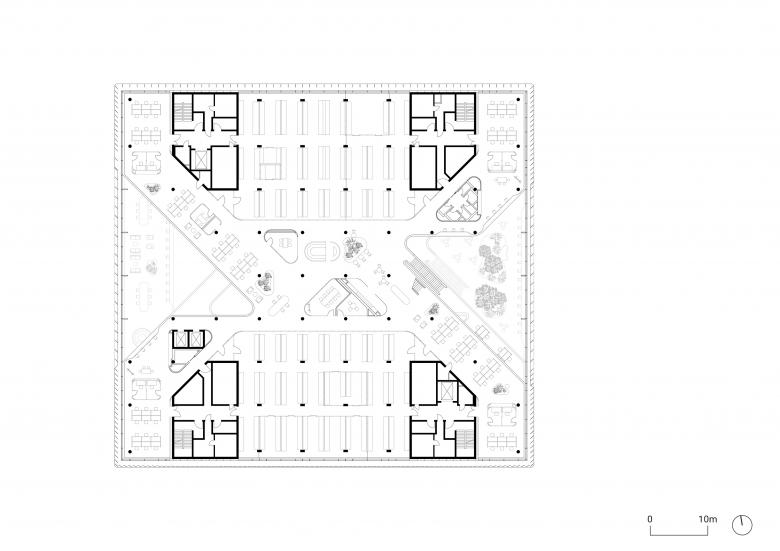 Auf den offenen Grundrissen der oberen Geschosse verbinden sich Labore und Büros zu einer zusammenhängenden Arbeitswelt. Die Laborflächen befinden sich gegenüberliegend an zwei Außenseiten des Gebäudes. Dazwischen spannt sich die Wissenswelt auf – mit Büroflächen und gemeinschaftlich genutzten Kommunikationsbereichen für fachlichen und informellen Austausch zwischen den Mitarbeitenden. Indem sich der Neubau mit gläsernen Wänden nach innen und außen öffnet, entstehen Blickbeziehungen zwischen allen Arbeitsbereichen, aber auch hinaus über den Campus. Die Interiors schaffen mit einer reduzierten Farbpalette eine angenehme Atmosphäre. Farbige Glaswände betonen die Laborbereiche.