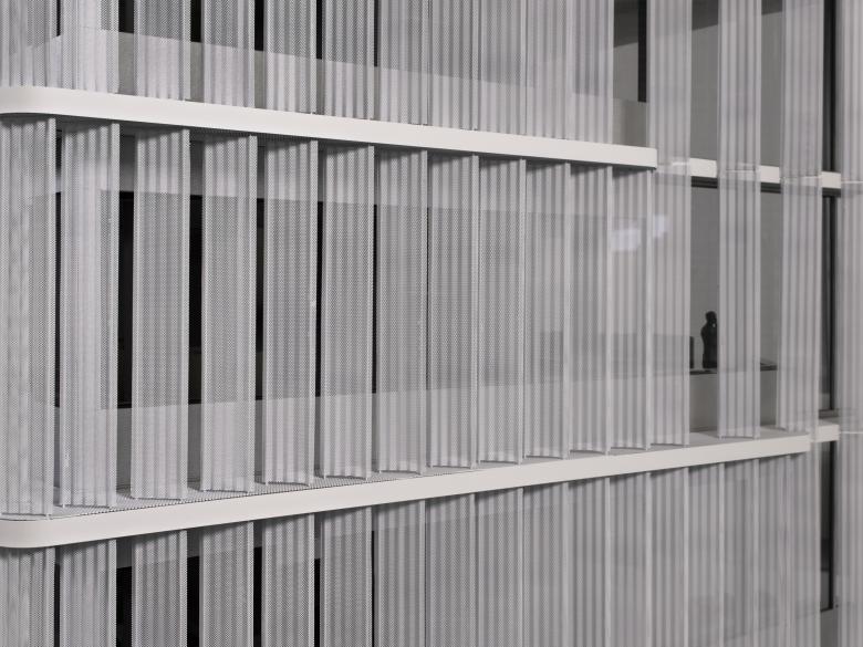 Auskragende Geschossplatten an der Südfassade und zurückspringende Terrassen im Norden sowie die außenliegenden Lamellen aus hellem, perforiertem Metall sorgen für eine Verschattung der Geschossflächen. Ihre Dichte und Orientierung ist nach der Sonne ausgerichtet und leistet einen vollständigen Sonnenschutz für das Gebäude. Auf dem Dach angebrachte Photovoltaikanlagen erzeugen Energie, während die Begrünung CO2 in Sauerstoff umwandelt und Feinstaub aus der Luft aufnimmt.