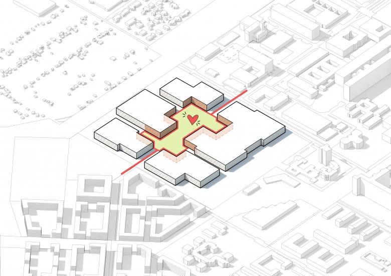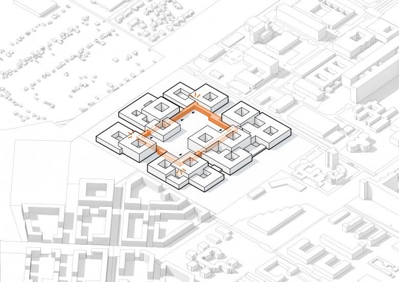 Der zentrale Klinikplatz ist das Herzstück des Ensembles. Er ist fußgängerfreundlich und autofrei konzipiert und mit einem Shuttlebus über die verlängerte Verbindungsachse an den Bestand angebunden. Der Loop, ein niedriger Laubengang, verläuft einmal um den Klinikplatz herum und verbindet alle Gebäude und Abteilungen. Er hilft bei der Orientierung, schützt vor der Witterung und rahmt den Platz gestalterisch.