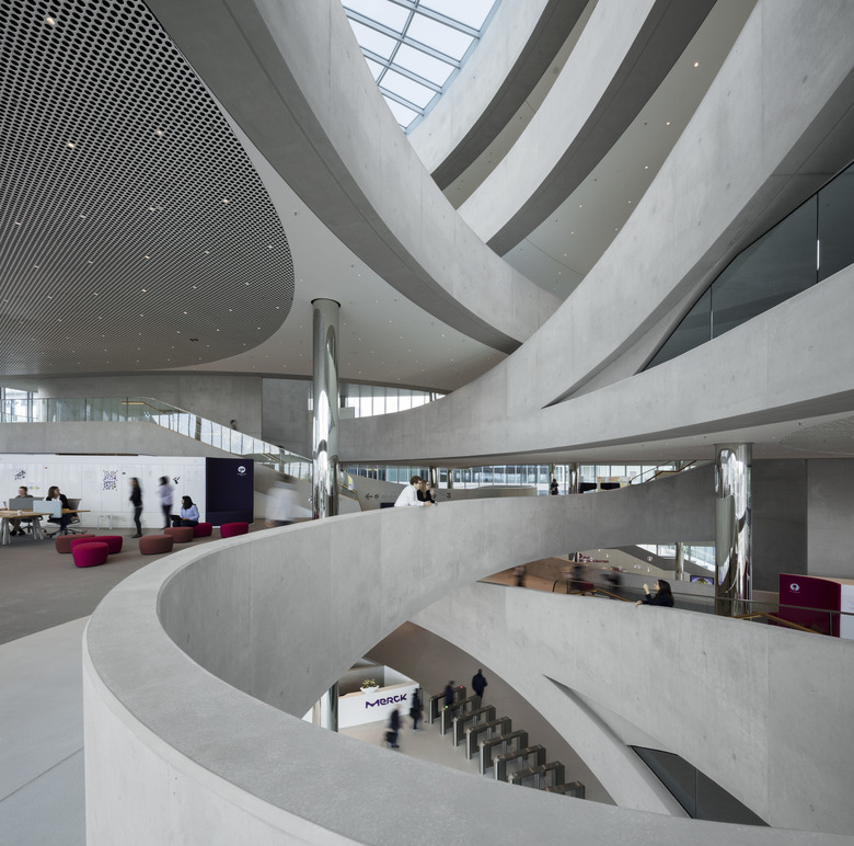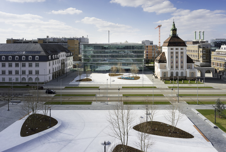 Das Gebäude ist gegenüber der Frankfurter Straße zurückgesetzt und gibt so einen öffentlichen Platz frei, den Emanuel-Merck-Platz. Die Orthogonalität des Baukörpers entwickelt sich aus dem Kontext der angrenzenden Gebäude heraus und steht im Kontrast zu seinem bewegten Innenleben. Hier entfaltet sich ein kontinuierlich fließendes Raumgefüge. Brückenartige Verbindungen spannen sich zwischen den ovalen Kernen diagonal durch den Raum und verbinden die einzelnen Arbeitsflächen. Treppen, Rampen und Flächen schrauben sich in die Höhe. Die Wege von einer Arbeitsgruppe zur anderen, von einer Ebene zur nächsten werden nahezu unbemerkt und unbeschwert bewältigt.