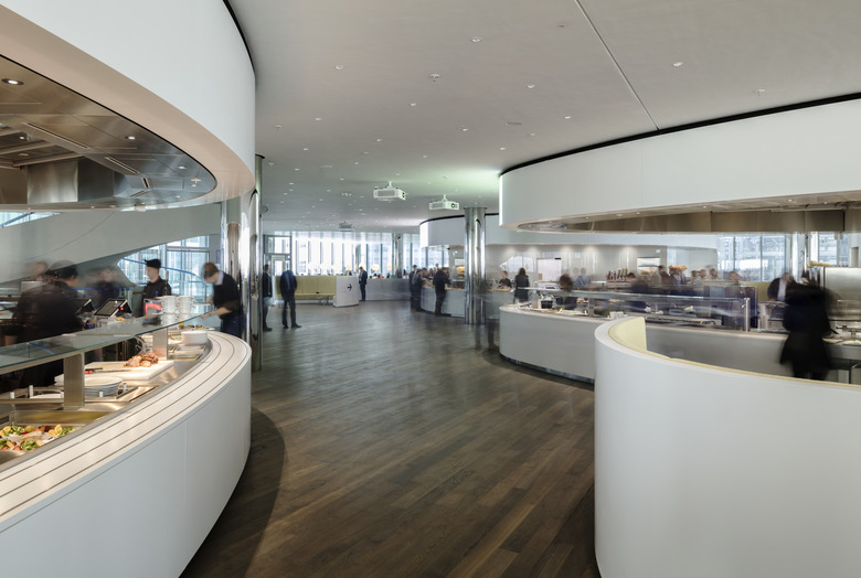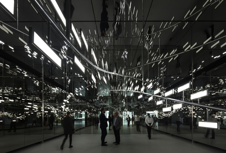 Die sich kreuzenden Brücken, die das Zentrum des Gebäudes verdichten und die Raumhöhe von sechs Metern über den Arbeitsplätzen auf drei Meter verringern, scheinen zu schweben. Die Lasten werden von Stützen entlang der Fassaden und nur vier Innenstützen aufgenommen. Durch eine hochpolierte Edelstahlhülle werden die Stützen nahezu entmaterialisiert.