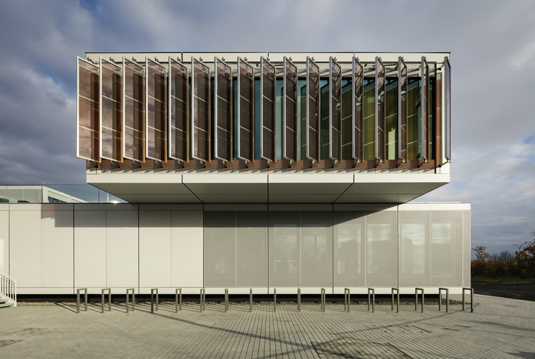 Ab 2018 soll das Gebäude dann als Besucherzentrum genutzt werden. Der Gebäudekörper besteht aus einzelnen, gegeneinander verschobenen und teils aufeinander gestapelten Modulen, die sich um einen Innenhof gruppieren. Ein schmaler, zurückspringender Sockel hebt die einzelnen Gebäudeteile vom Boden ab und lässt sie schweben. Das Fassadenraster betont die Fugen und lässt die modulare Bauweise aus einzelnen vorgefertigten Stahlelementen erkennen. Raumhohe Fenster geben den Blick auf den großzügigen Platz und den Innenhof frei. Am gesamten Gebäude werden mehrere, von Merck entwickelte Innovationen angewendet und getestet. Die rötlichen Lamellenelemente, die an den Südseiten des Baukörpers als Sonnenschutz dienen, enthalten farbstoffsensibilisierte Solarzellen, die Strom für einen Ein-Personen-Haushalt produzieren. In der exponierten Westfassade öffnet sich eine Fensterfront aus Liquid Crystal Windows von Merck. In der High-Tech-Beschichtung der Gläser wirken Flüssigkristallmoleküle wie mikroskopische Jalousien. Per Knopfdruck lassen sich die Fenster abdunkeln, sodass sie die Tagungsräume vor der Sonne schützen, ohne die Sicht auf den Platz zu beeinträchtigen. Die Verwendung von Technologien wie den farbstoffsensibilisierten, organischen Solarzellen und den intelligenten Flüssigkristallfenstern macht das Modulgebäude zu einem Vorzeigeprojekt für Innovationen von Morgen.