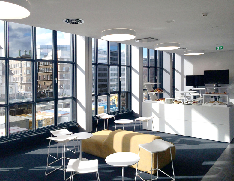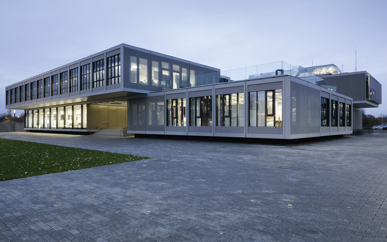 Mit der strategischen Initiative ONE Global Headquarters entwickelt Merck seinen Stammsitz in Darmstadt zu einer globalen Konzernzentrale weiter. Der Masterplan für das Unternehmensgelände sieht einen neuen, zentralen Platz an der Frankfurter Straße vor, um den sich das Werksgelände von Merck, einem führenden Unternehmen für innovative und hochwertige Hightech-Produkte in den Bereichen Healthcare, Life Science und Performance Materials, gruppiert. Gerahmt von zwei Bestandsbauten, entsteht auf dem Emanuel- Merck-Platz derzeit das zukünftige Innovationszentrum. Vis-a-vis an der Ostkante des Platzes wurde ein zweigeschossiger modularer Baukörper mit einer Grundfläche von 4.000 m² errichtet, das sogenannte Modulare Innovationszentrum. Bis zur geplanten Fertigstellung des zukünftigen Innovationszentrums Ende 2017 nimmt der modulare Neubau Arbeitsflächen für wechselnde interdisziplinäre Projektteams sowie ein Gästecasino und daran angeschlossene Tagungsräume auf.