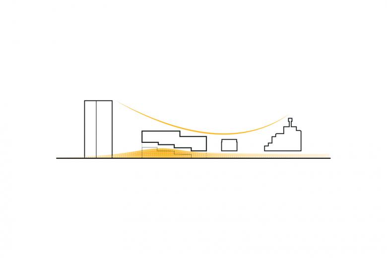 Die einzigartige Kubatur des Neubaus setzt den städtebaulichen Rahmen und vermittelt durch die gestaffelte terrassierte Höhenentwicklung zwischen dem Blumau Tower und dem Stammhaus. Die innenliegende Plaza zeichnet sich bis an die Gebäudefassaden ab und erzeugt einen schwebenden Eindruck der höheren Ebenen.