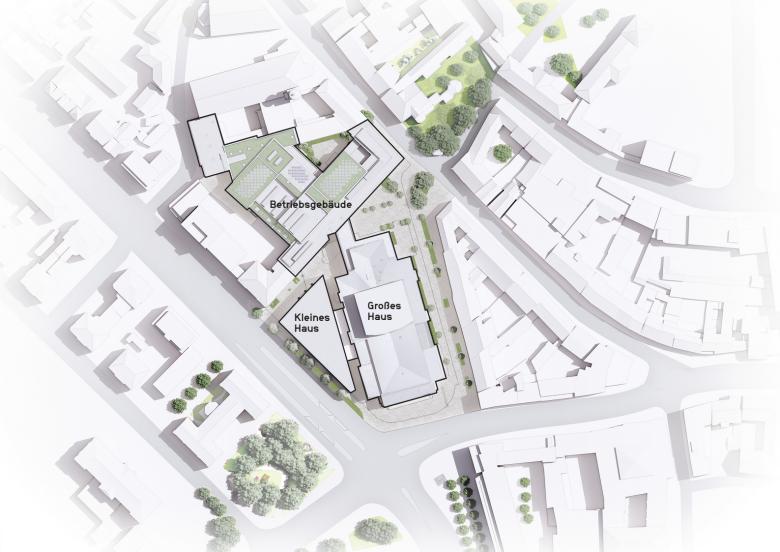 Im rückwärtigen Teil des Grundstücks entsteht ein Betriebsgebäude, das unter anderem eine Kantine, Werkstätten, Probebühnen und Büros für die Verwaltung umfasst.