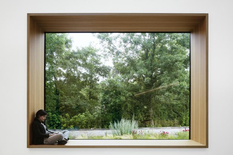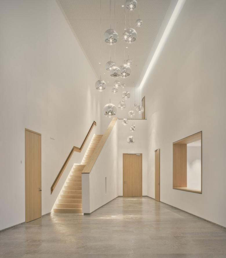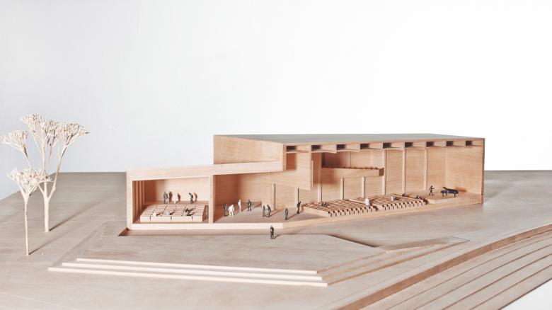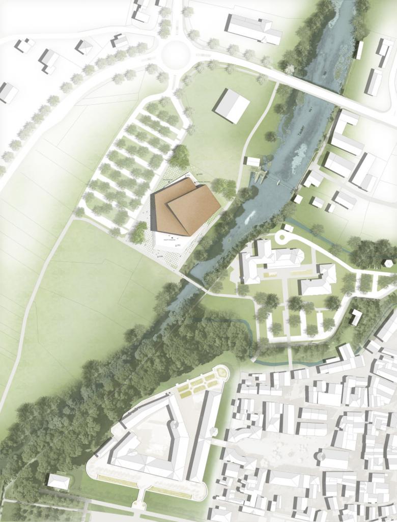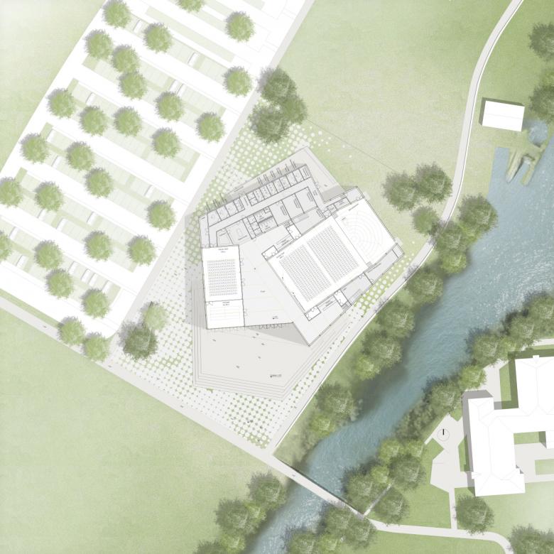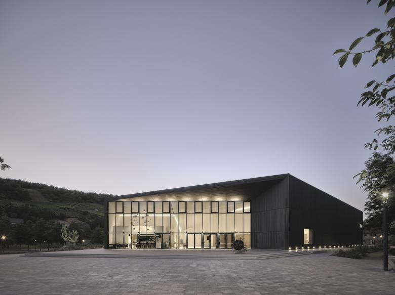 Das eingeschossige Gebäude mit den leicht geneigten Dächern setzt sich aus zwei Baukörpern zusammen: Im größeren Volumen befindet sich der Hauptsaal, dessen trapezförmige Bühne, schrägen Wandpaneele und reflektierenden Deckenelemente für optimale akustische Bedingungen sorgen. Je nach Bedarf kann dieser Saal durch seine flexible Bestuhlung multifunktional genutzt werden, wie etwa für Konzerte, Kino, Kongresse, Ausstellungen oder Schul- und Vereinsfeiern. Die Rückseite lässt sich zum Foyer öffnen, sodass er auch als Ort für Großveranstaltungen dienen kann. Im niedrigeren Gebäudeteil befinden sich der kleine Saal, der sich in zwei kleinere Einheiten separieren oder ebenfalls zum Foyer öffnen lässt. Im Südosten markiert ein tiefer Einschnitt in die Fassade den Haupteingang. Mittels einer großflächigen Glasfront öffnet sich das Foyer mit einer vorgelagerten Terrasse einladend zum Vorplatz.