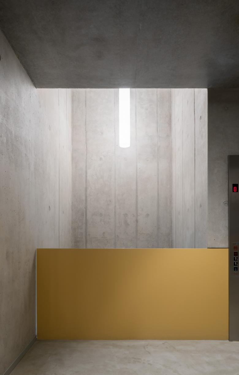Um den Sporthallenneubau als weiteren Baustein auf dem Schulcampus baulich und gestalterisch einzubinden wird die Methodik verwendet, den vorgefundenen Material- und Farbkanon aus dem Bestand aufzunehmen und neu zu interpretieren. Die Steinfassade des Altbaus, welche bereits im Erweiterungsneubau aufgenommen wurde, umkleidet auch den Baukörper der Sporthalle. Mit der Streckmetall-Fassade des hofseitigen Funktionsbereiches wird Bezug genommen auf die im neuen Fluchttreppenhaus des Schulhauses eingesetzten Materialien.