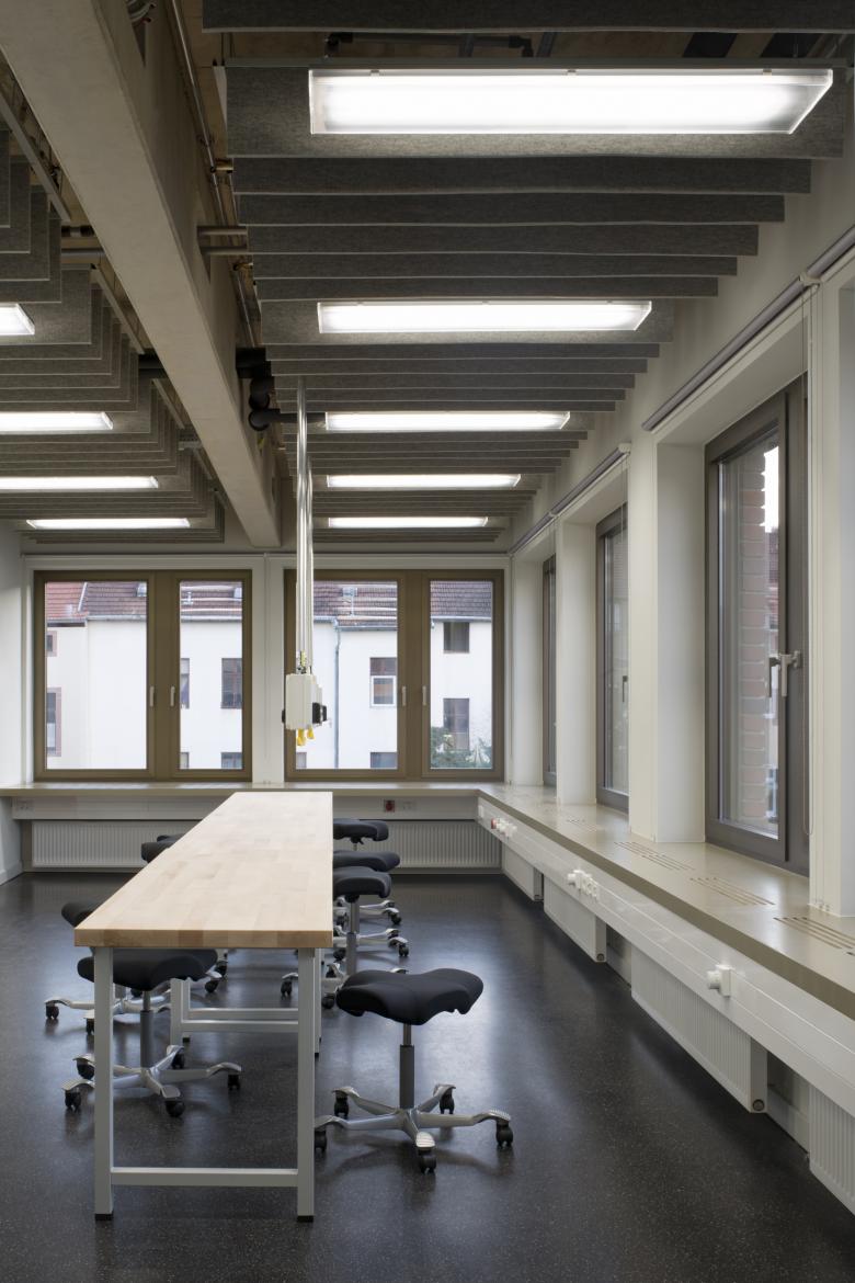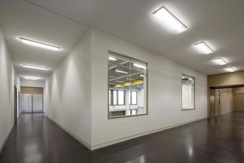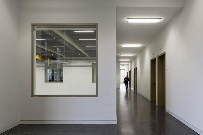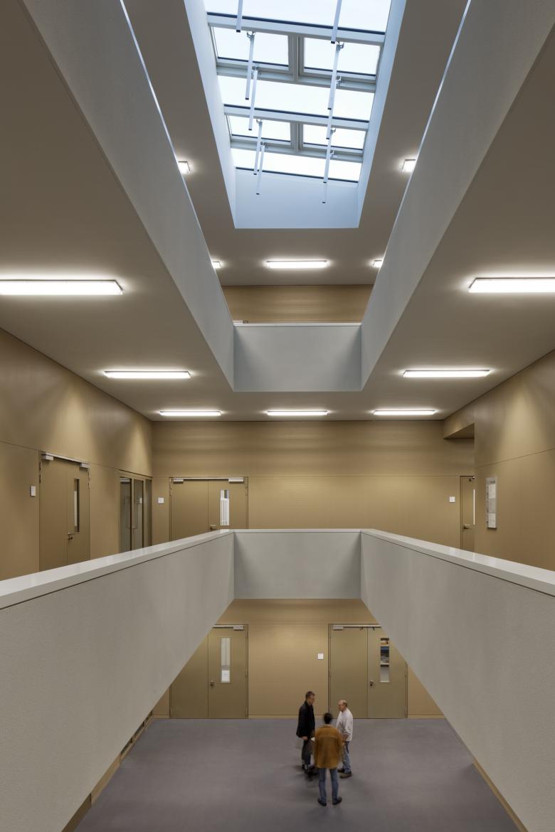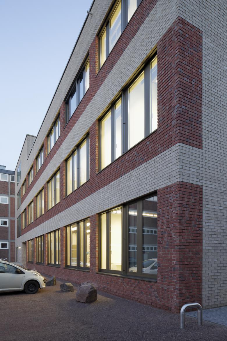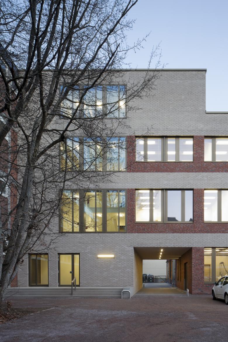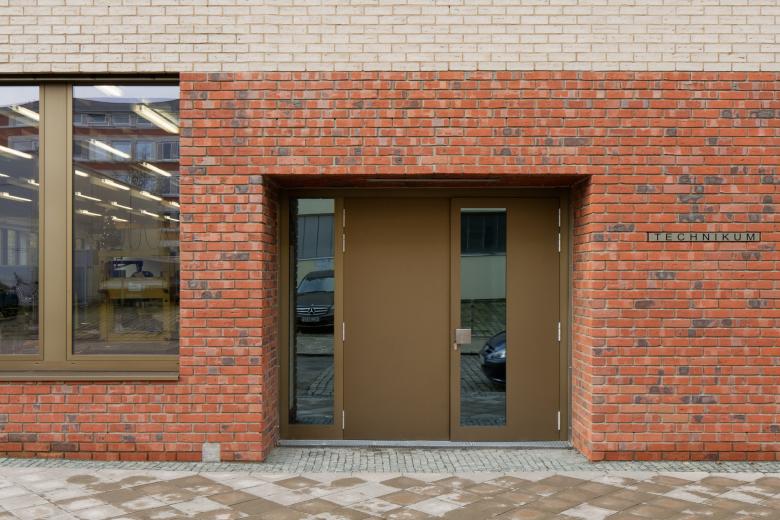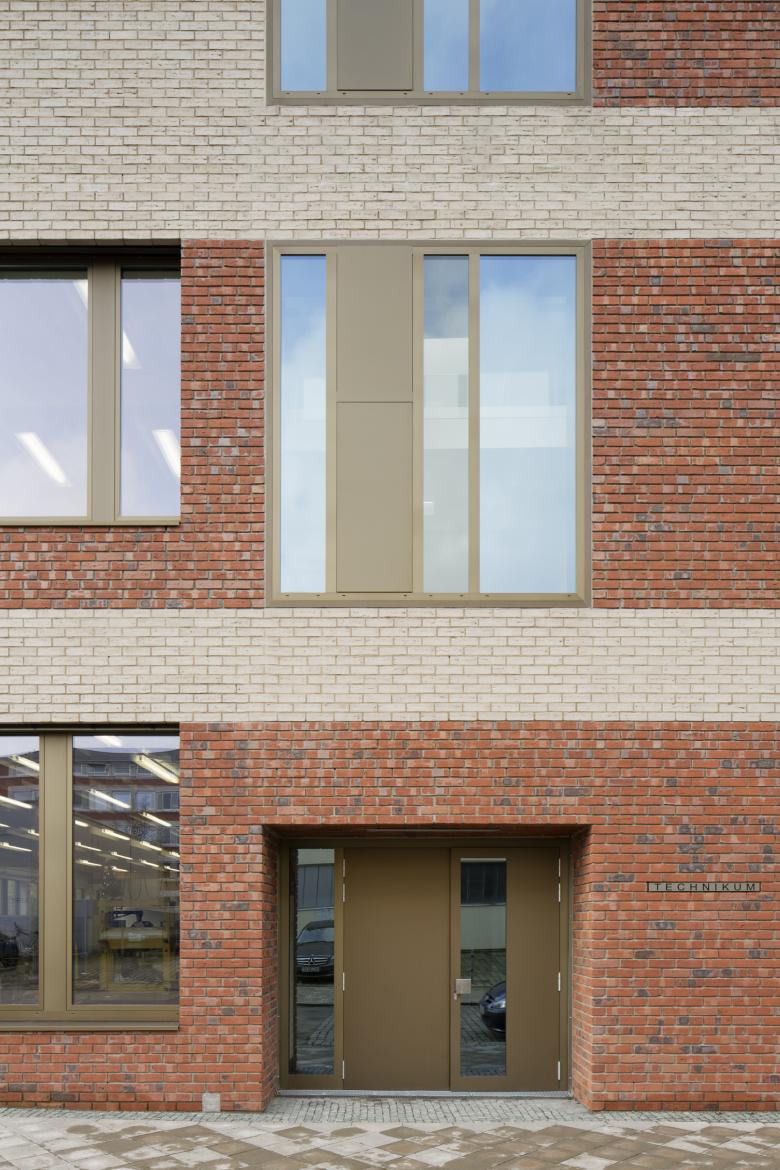 Mit den bestehenden Institutsgebäuden bildet das neue Technikum einen weiteren, an die fußläufige Verbindung des gesamten Standortes angebundenen, großen Hof. Durch seine Setzung wirkt der Neubau hier als Lärmabschirmung zur Autobahn und ermöglicht geschützte Aufenthaltsbereiche für die Hochschule und die angrenzenden Wohngebäude. Die Eingänge erfolgen an der Schnittstelle vom Altbau mit dem Neubau und in Verlängerung der campusinternen Wegeverbindung, die Andienung über den Lieferhof an der Werderstraße. Im Erdgeschoß befinden sich Werkstätten, Lager und Bereiche, deren Nutzung die räumliche Nähe zur Andienung erfordern. In den Obergeschossen sind den Mess- und Prüfräumen der Fachbereiche die jeweiligen Büros angegliedert worde.