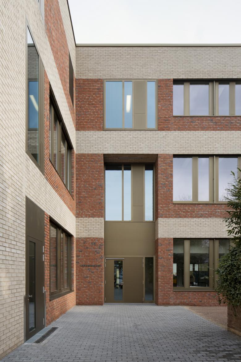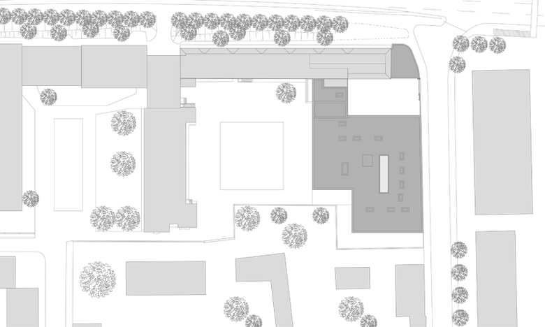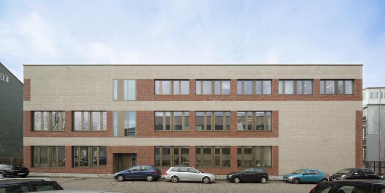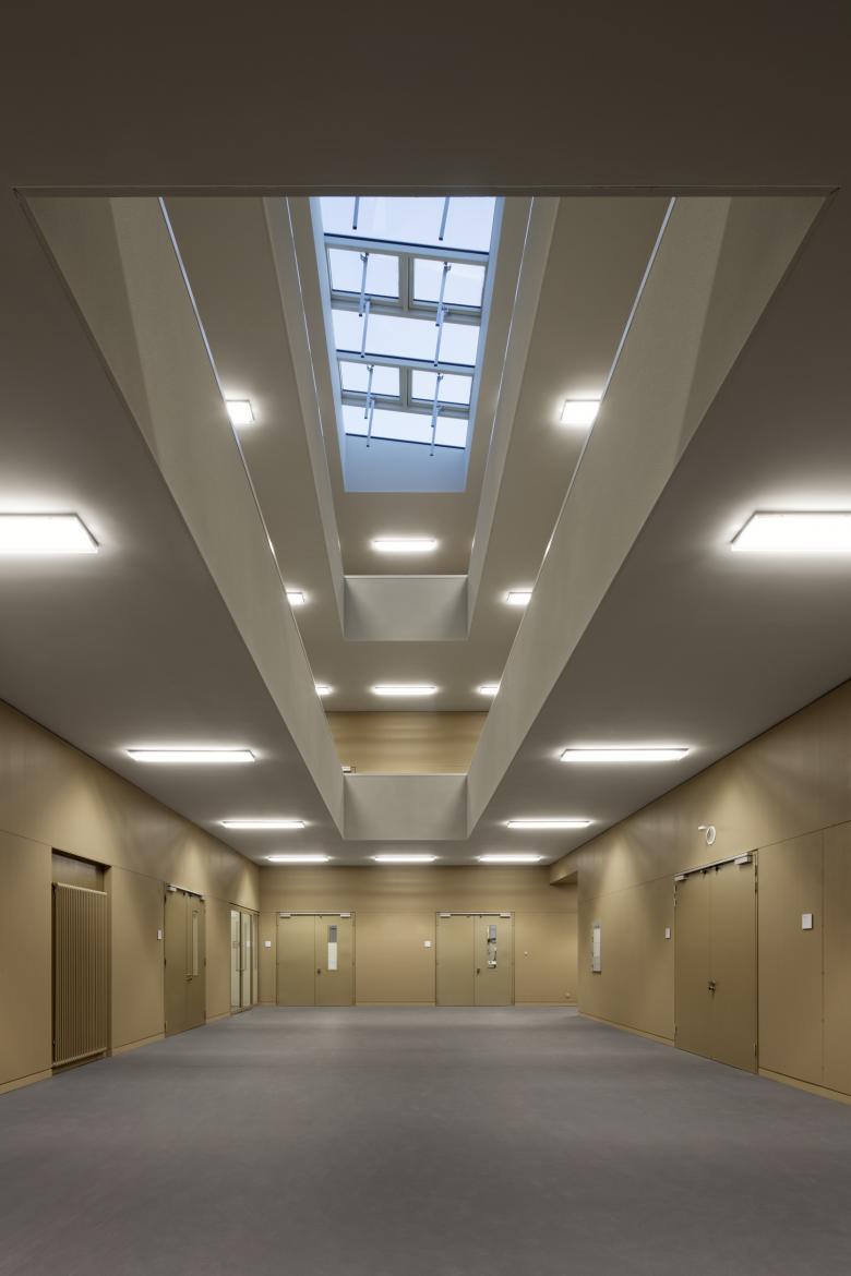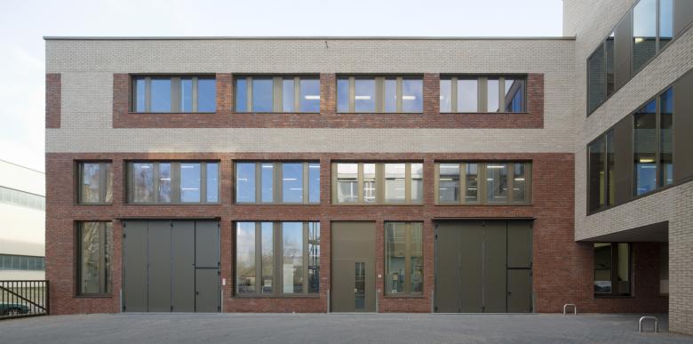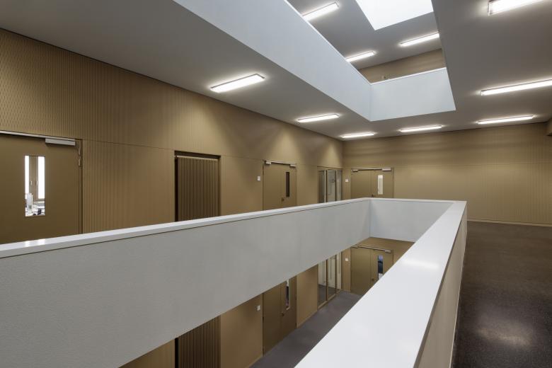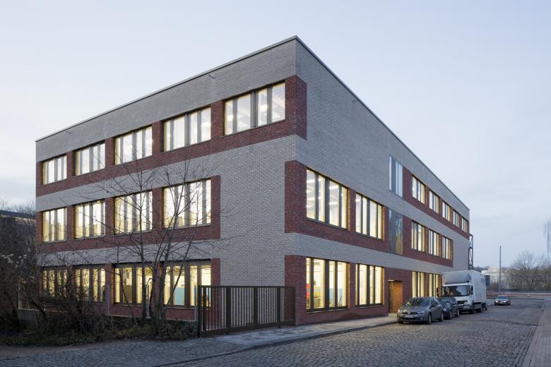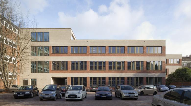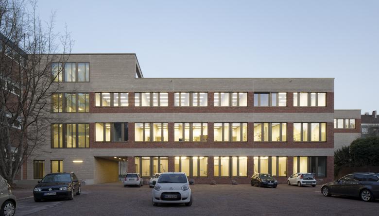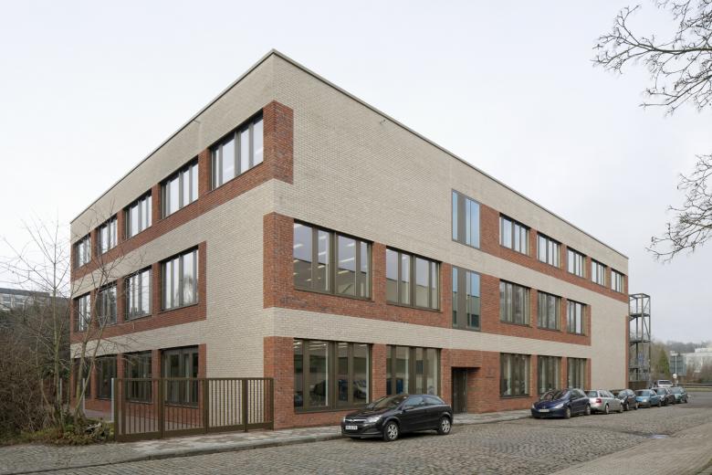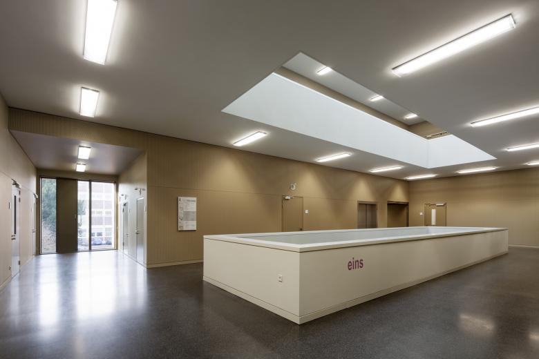 Mit den bestehenden Institutsgebäuden bildet das neue Technikum einen weiteren, an die fußläufige Verbindung des gesamten Standortes angebundenen, großen Hof. Durch seine Setzung wirkt der Neubau hier als Lärmabschirmung zur Autobahn und ermöglicht geschützte Aufenthaltsbereiche für die Hochschule und die angrenzenden Wohngebäude. Die Eingänge erfolgen an der Schnittstelle vom Altbau mit dem Neubau und in Verlängerung der campusinternen Wegeverbindung, die Andienung über den Lieferhof an der Werderstraße. Im Erdgeschoß befinden sich Werkstätten, Lager und Bereiche, deren Nutzung die räumliche Nähe zur Andienung erfordern. In den Obergeschossen sind den Mess- und Prüfräumen der Fachbereiche die jeweiligen Büros angegliedert worde.