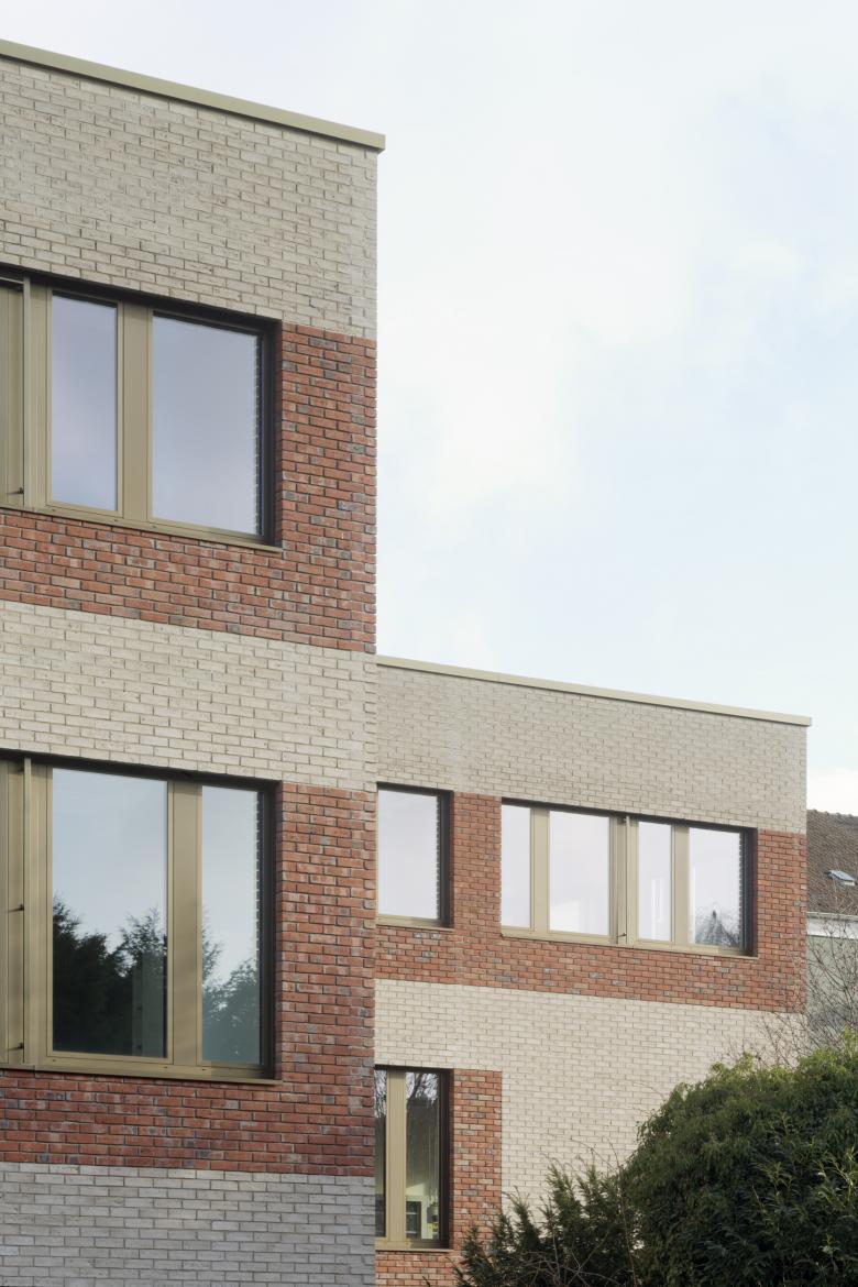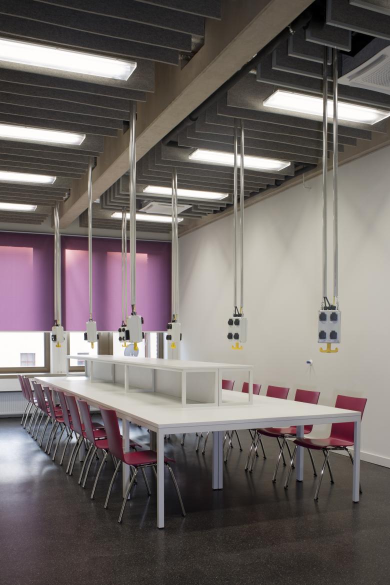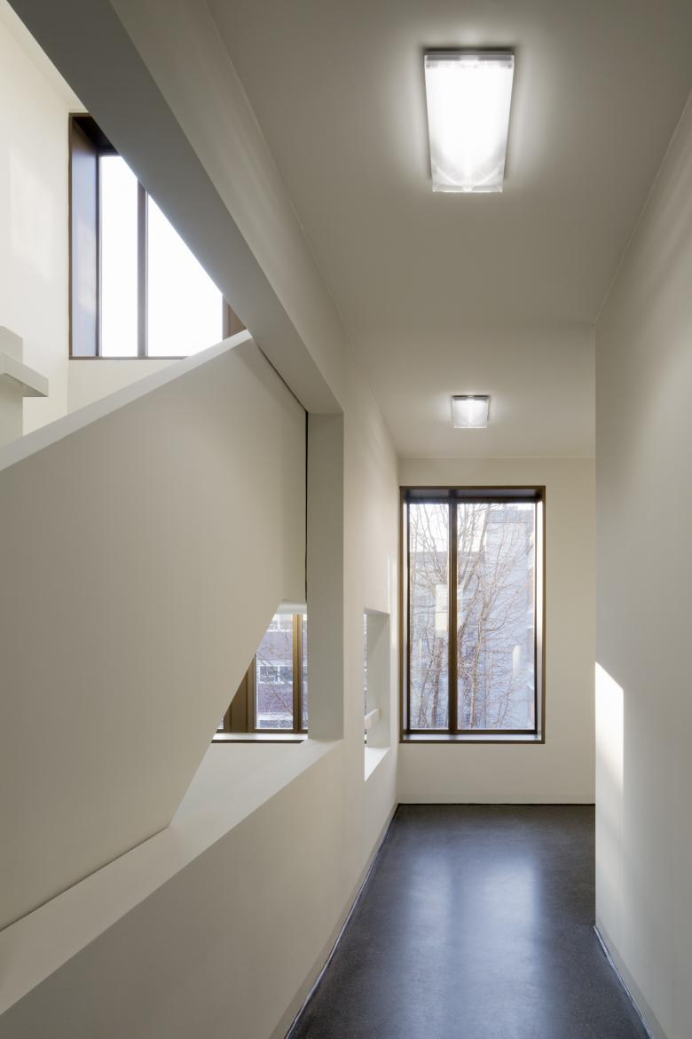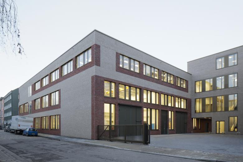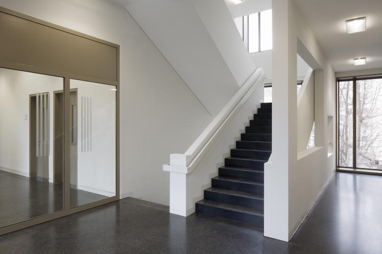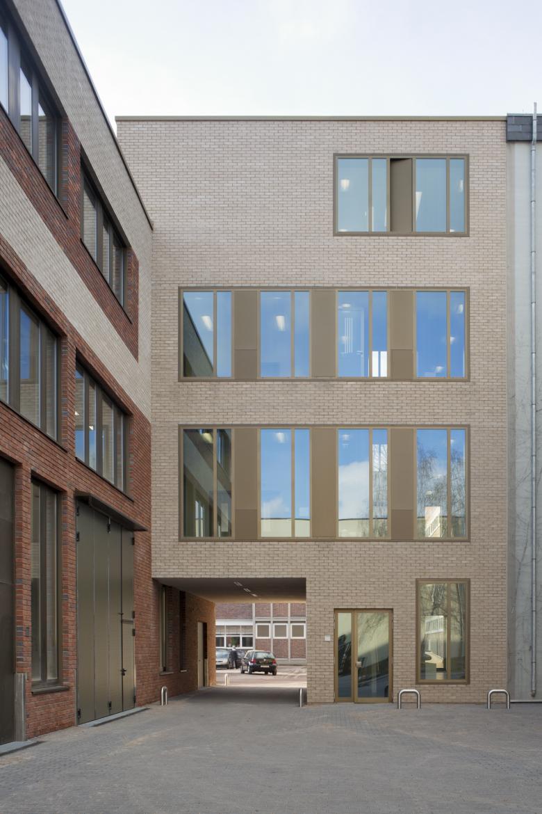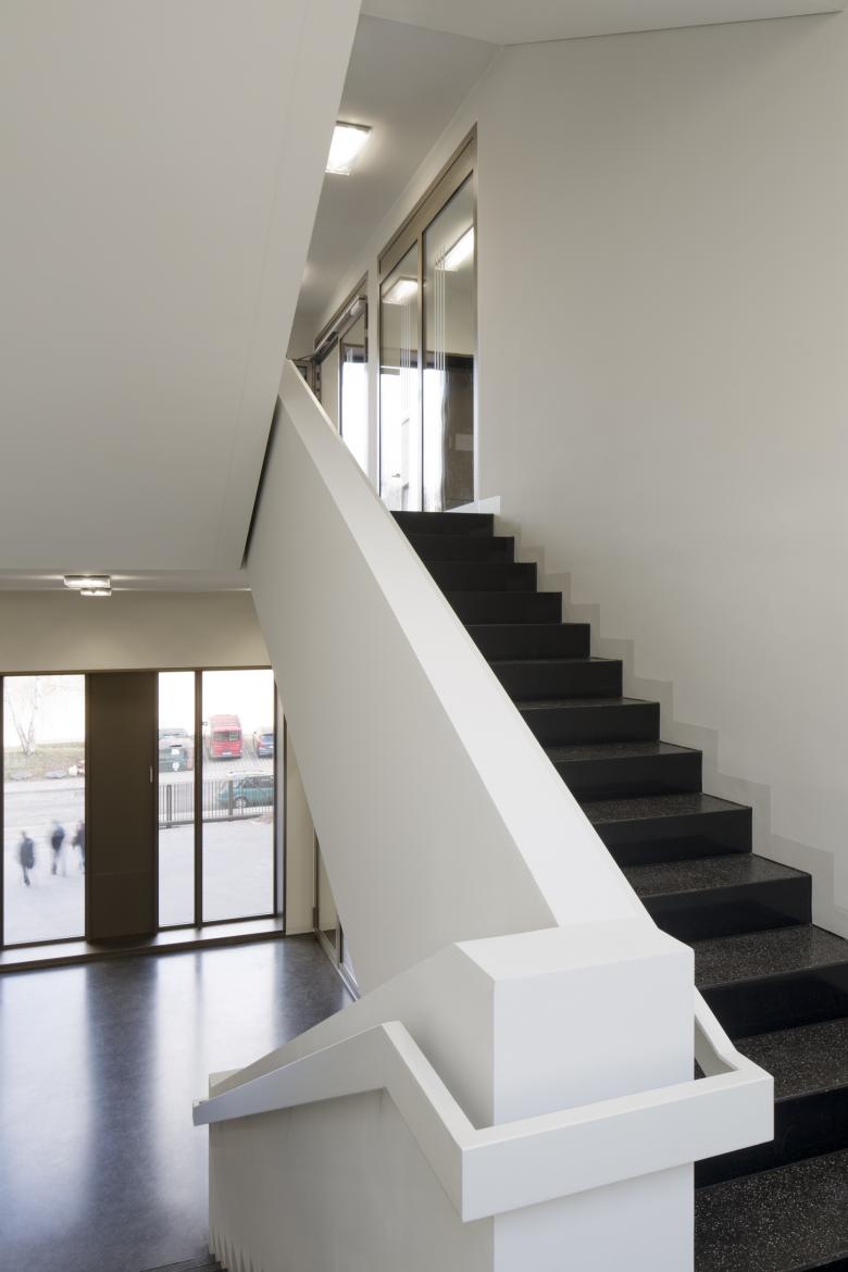Mit den bestehenden Institutsgebäuden bildet das neue Technikum einen weiteren, an die fußläufige Verbindung des gesamten Standortes angebundenen, großen Hof. Durch seine Setzung wirkt der Neubau hier als Lärmabschirmung zur Autobahn und ermöglicht geschützte Aufenthaltsbereiche für die Hochschule und die angrenzenden Wohngebäude. Die Eingänge erfolgen an der Schnittstelle vom Altbau mit dem Neubau und in Verlängerung der campusinternen Wegeverbindung, die Andienung über den Lieferhof an der Werderstraße. Im Erdgeschoß befinden sich Werkstätten, Lager und Bereiche, deren Nutzung die räumliche Nähe zur Andienung erfordern. In den Obergeschossen sind den Mess- und Prüfräumen der Fachbereiche die jeweiligen Büros angegliedert worde.