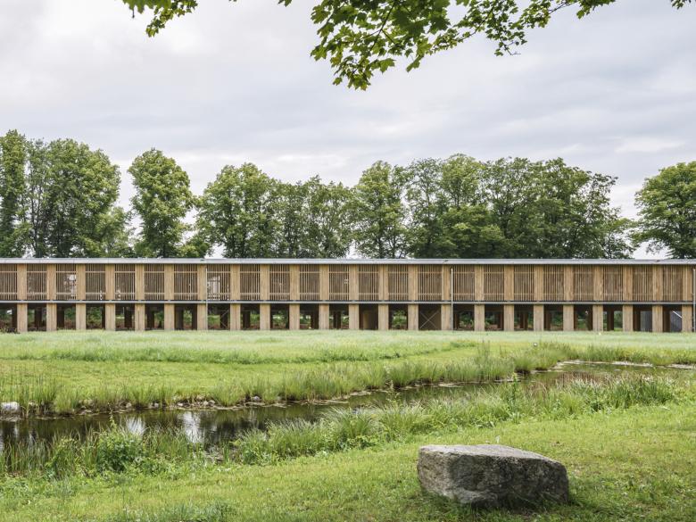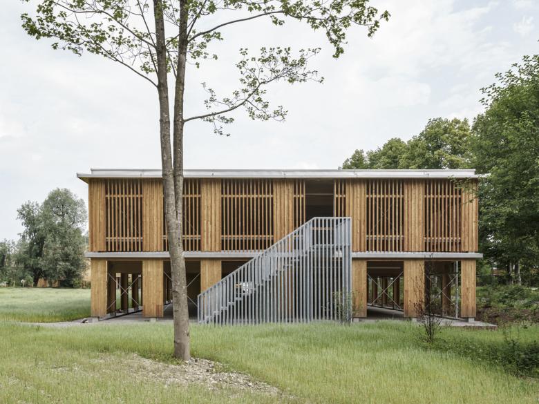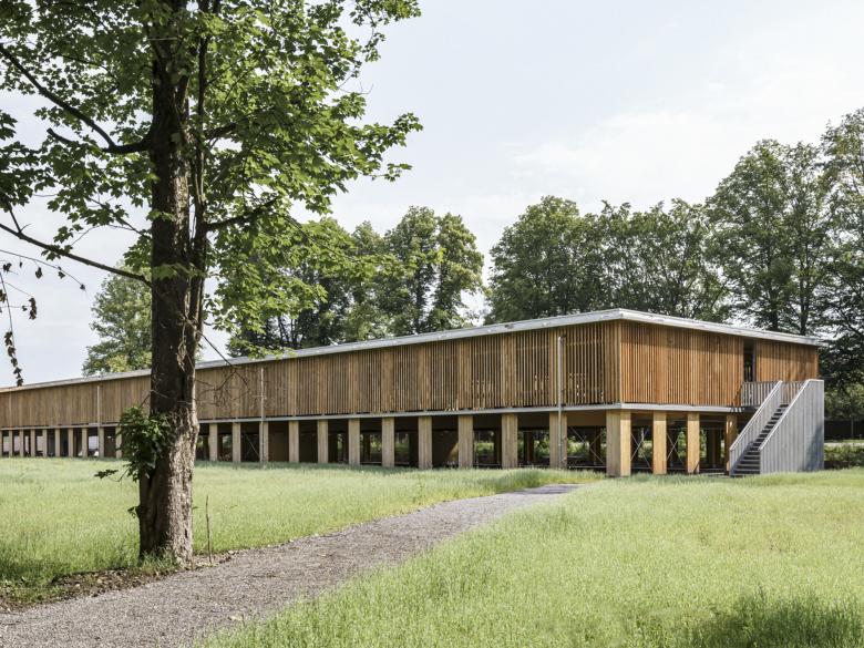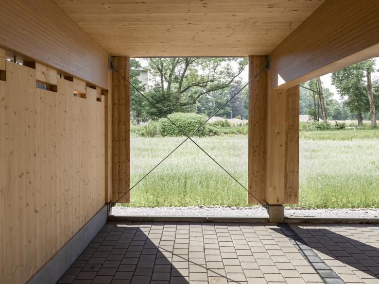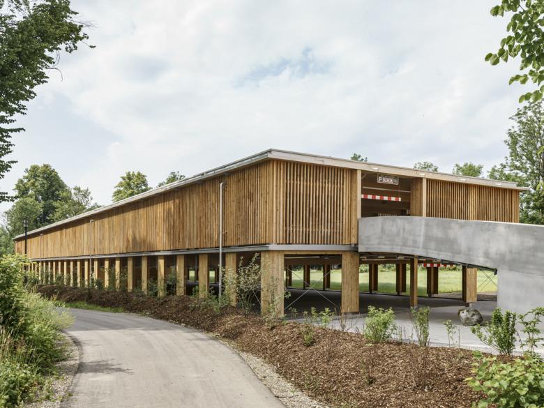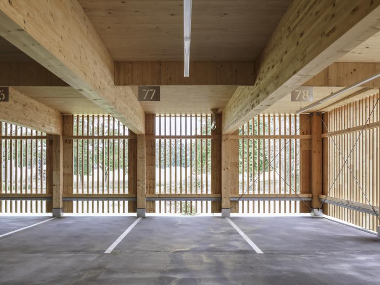 Selbst das Parkhaus wurde vornehmlich aus Holz gefertigt, die tragenden Elemente in Baubuche sowie Brettschicht- und Brettsperrholz konstruiert. Der transluzente, zweigeschoßig gegliederte Pavillon fügt sich zurückhaltend in die von altem Baumbestand gesäumte Parklandschaft, in welcher er sich als additive Längs-Struktur entlang der Hauptverkehrsader erstreckt.
