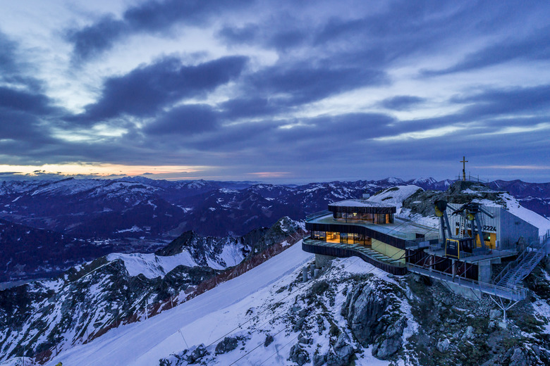 Um die Bergspitze in Szene zu rücken, wurde das Gebäude von der Seilbahn abgesetzt und damit das Plateau freigeräumt, auf dem die Besucherinnen und Besucher ankommen. So bleibt der Blick auf den Gipfel frei, denn das Restaurant befindet sich unterhalb der Ankunftsebene. Auf der Oberseite steht lediglich ein Pavillon, der als Eingang zum Restaurant dient und ein offenes Bistro beherbergt.