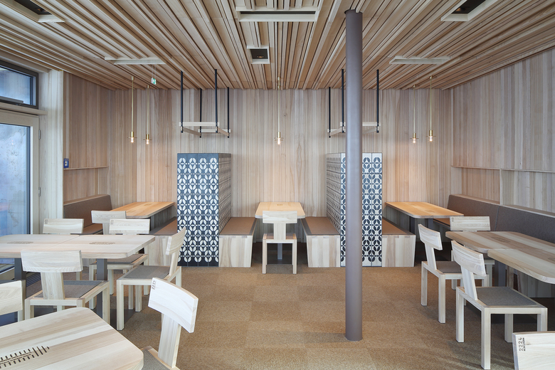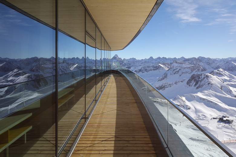 Formal nimmt das Restaurant eine eigenständige Position ein: Jenseits von Alpenkitsch und geometrischen Zwängereien reizt es die konstruktiven und gestalterischen Möglichkeiten des Holzbaus aus. Die geschwungenen Linien der Terrasse folgen dem Geländeverlauf, mit seinen abgerundeten Glasfronten bringt das Restaurant urbane Eleganz auf den Gipfel.