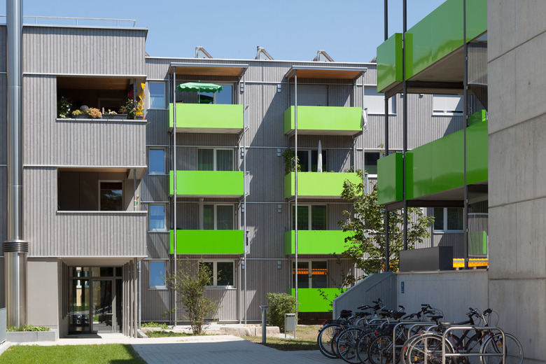 Das Konstruktionsmaterial des Hauses zeigt sich offen. Die Außenhülle wurde im Werk vorgefertigt, ihre Wärmedämmung entspricht den Passivhausanforderungen. Die Verschalung der Fassaden erfolgte mit sägerau belassenen, senkrechten, grau lasierten Fichtenbrettern. Auf Grund langjähriger Erfahrung mit dieser Art von Außenverkleidung kann von einer langen Haltbarkeit und niedrigen Erhaltungskosten ausgegangen werden. Auch hier soll die Fassade den Holzbau erlebbar machen, die farbige Behandlung ist der Integration in den Kontext geschuldet und ein behutsamer, gesteuerter Vorgriff auf den charakteristischen Alterungsprozess des Holzes. Vergleiche von Gebäuden in konventioneller Bauweise, die zahlreiche Bauprodukte aus endlichen Rohstoffen enthalten, und Gebäuden mit einem hohen Anteil an Bauelementen aus nachwachsenden Rohstoffen haben die erheblichen Entlastungspotenziale aufgezeigt, welche die Letzteren für das Ökosystem bieten.