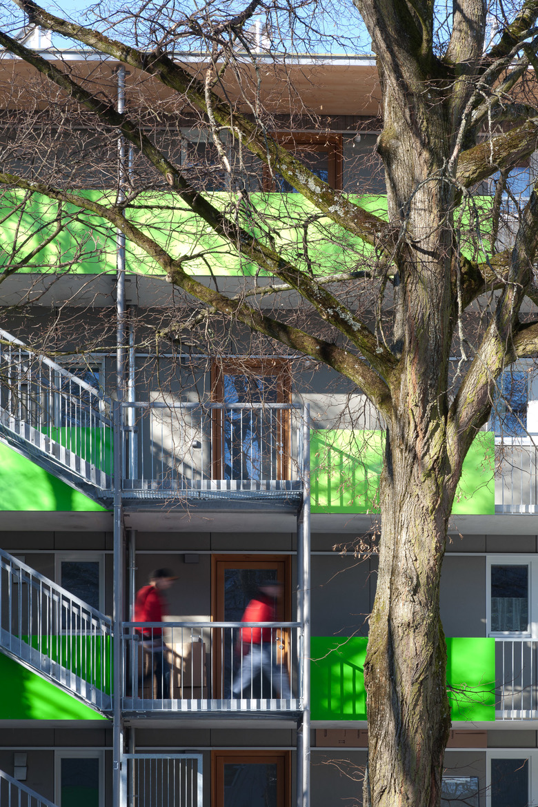 Bei diesem Bau wurde erstmals in München ein viergeschossiges Wohn- bzw. Bürogebäude mit sichtbaren Holzdecken ausgeführt. Im Erdgeschoss sowie im östlichen Teil des 1. Obergeschosses befindet sich die Hausverwaltung der GWG München Sendling-Westpark-Hadern. Alle weiteren Flächen sind frei finanzierten Mietwohnungen vorbehalten. Auf Grund der gemischten Nutzung in einem Gebäude waren sowohl konstruktiv als auch bauphysikalisch sehr komplexe Herausforderungen zu meistern. Darüber hinaus ist das Gebäude nach den neuesten Erkenntnissen des modernen Holzbaus konstruiert: Auf den tragenden vorgefertigten Rahmenholzwänden und Einzelstutzen lagern Stahlträger, auf denen wiederum Brettsperrholzelemente verlegt wurden. Deren Unterseite bleibt sichtbar und verleiht den Wohnungen einen besonderen Charakter.