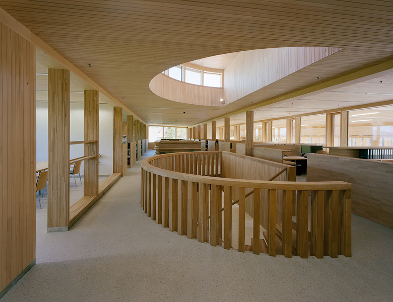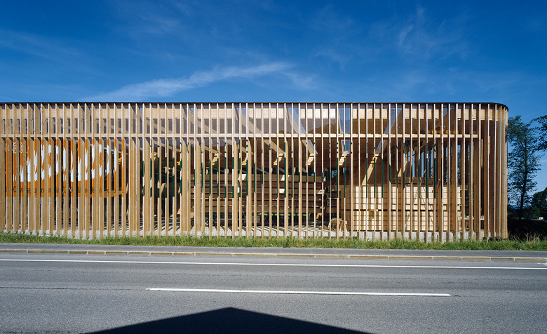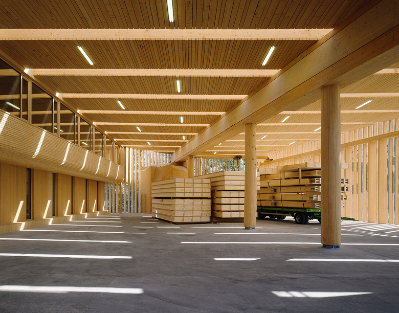 Auf ein massives Sockelgeschoss ist das komplett in Holz konstruierte Bürogebäude gesetzt, auf welchem das Dach der offenen Halle aufliegt.