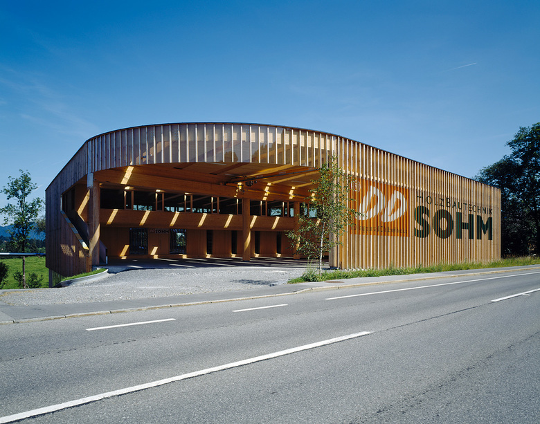 Die Firma Sohm in Alberschwende, Bregenzerwald – ein innovatives und wachsendes Holzbauunternehmen – hatte die Möglichkeit, sich auf einem neu zugekauften Grundstück zu vergrößern. Das stark abfallende Grundstück ermöglichte es, im Untergeschoss Lagerflächen sowie eine neue Heizanlage zu integrieren und im Erdgeschoss eine gedeckte aber offene Mehrzweckhalle mit angegliedertem zweigeschossigen Büroteil zu errichten.