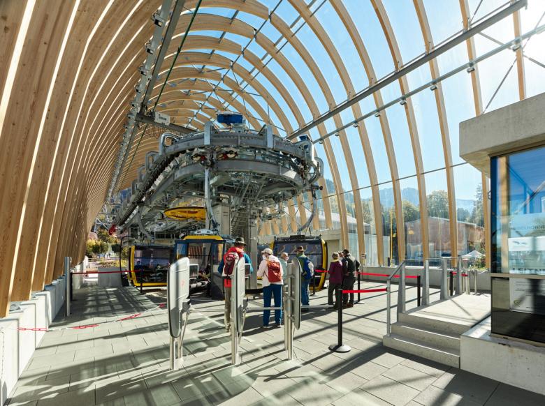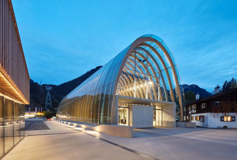 Die Bahnstation wird als selbstverständlicher Bestandteil des öffentlichen Raumes von Oberstdorf interpretiert, sie dient als zentraler Anlaufpunkt für die Besucher. Eine Reduktion der Architektur auf die reine Funktion unterstreicht ihre Bedeutung als direkte Schnittstelle zwischen Ortsgebiet und alpinem Landschaftsraum. Durch eine regelmäßige Reihung von Holzparabeln, die von gebogenen Verbundsicherheitsgläsern umhüllt sind, entsteht ein transparent schimmerndes Volumen, das Leichtigkeit und Offenheit ausstrahlt. Je nach Fahrtrichtung wird die Struktur als Tor in die Berge oder ins Tal wahrgenommen.