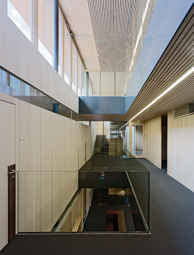 Die Obergeschosse sind über großzügige Lufträume verbunden, die das Licht aus dem Dachgeschoss in die Gebäudemitte lenken.