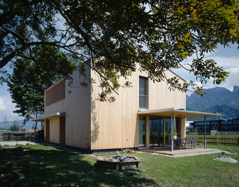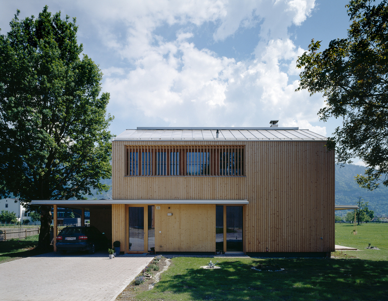 Das kleine Einfamilienhaus ist nun also ein modernes Bauernhaus aus Holz gebaut. Es steht auf dem von uns vorgeschlagenen Ort im richtigen Abstand zum bestehenden Baum, verkleidet mit naturbelassener, senkrechter, sägerauer Weisstannen-Schalung. Nach Süden und Westen orientiert, von Norden erschlossen und nicht unterkellert mit kleinen Anbauten für das unumgängliche Auto sowie dem gedeckten Freisitz gibt es sich ruhig und bescheiden, seine Dimension ist das Ergebnis eines eingehenden Optimierungsprozesses. Ebenfalls bescheiden ist der Heizenergieverbrauch durch optimierte Gebäudehülle und gutem Verhältnis von Oberfläche zu Volumen, ungefähr 2 Kubikmeter Holz dürften ausreichen, das Haus warm zu halten. Die tief sitzenden, dadurch geschützten Passivhausfenster zeigen den hohen Dämmstandard und geben dem Holzbau eine ungewöhnliche Plastizität, welche durch das bündig sitzende asymmetrische Dach noch stärker betont wird.