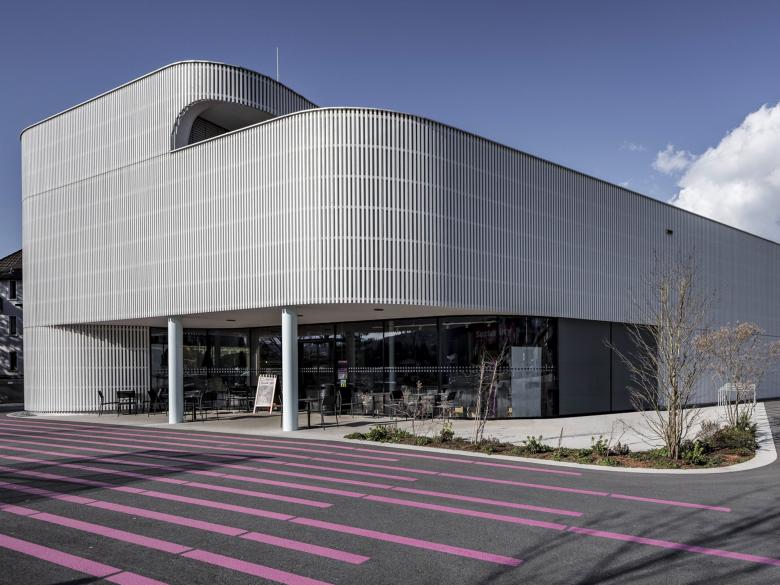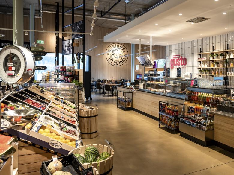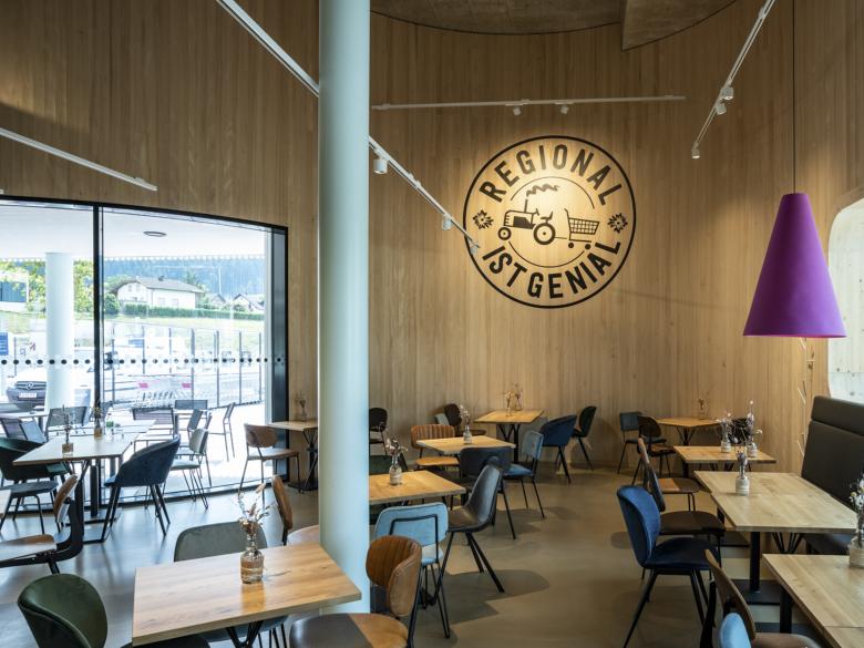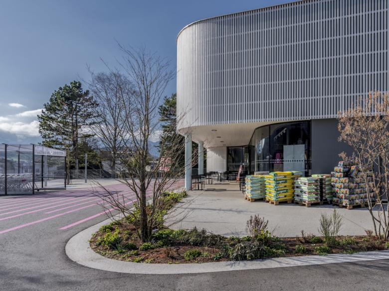 Am Saum zwischen den Gewerbeflächen und Wohnquartieren der Marktgemeinde Frastanz markiert das zurückhaltende Volumen den Kreuzungsbereich von zwei stark frequentierten Hauptverkehrsadern. Die Kunden des regionalen Nahversorgers betreten die doppelstöckige Verkaufshalle vom Parkplatz aus über eine gedeckte Vorzone und den behaglich gestalteten Bistro-Bereich, der sich zur Abendsonne öffnet. Im Sinne einer städtebaulichen Verdichtung konzipierten die Planer im Obergeschoß zehn Wohnstudios. Diese werden durch einen schallabsorbierenden Laubengang auf der Straßenseite erschlossen und orientieren sich über großzügig dimensionierte Loggien nach Süden. Die gesamte Anlage nutzt keine fossilen Energieträger; so erfolgt die Heizung des Marktes ausschließlich über die Wärmerückgewinnung aus der Kühlanlage.