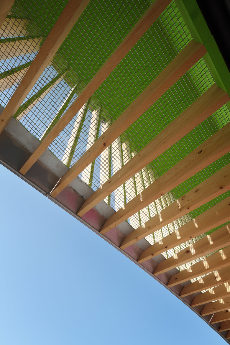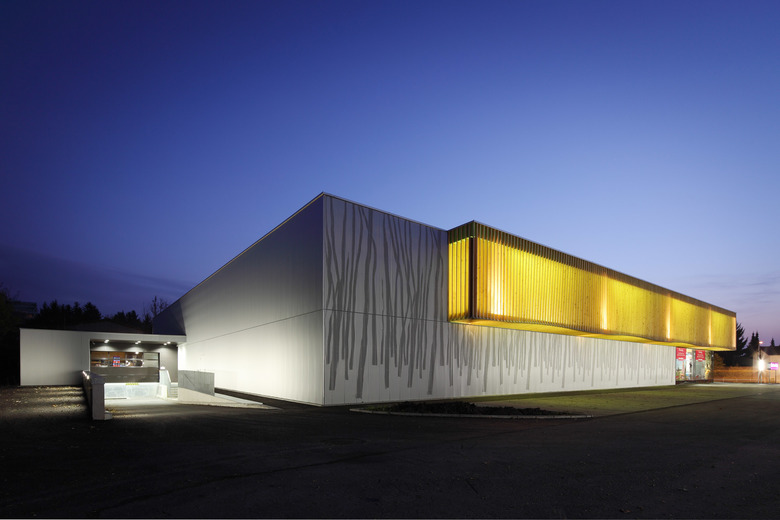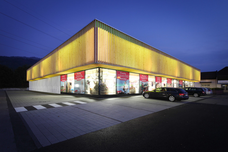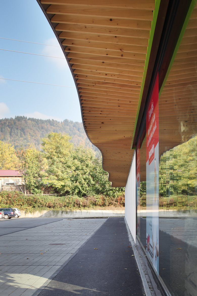 Hier galt es, das strenge Volumen aufzulösen, was erreicht wurde indem die notwendigen überdeckten Flächen aus diesem herausgearbeitet wurden. Diese damit entstandenen Auskragungen wurden zum gestalterischen Thema und zum Element der Fassadengliederung. Während die eigentliche gedämmte Außenhülle entweder mit Aluminium bekleidet oder verglast ist, sind die vorkragenden Volumen als leichte, durchscheinende, transparente Vorbauten gestaltet, die in der Nacht hinterleuchtet werden. Somit erzielt der Markt die notwendige Aufmerksamkeit, da er eigentlich in zweiter Reihe steht.