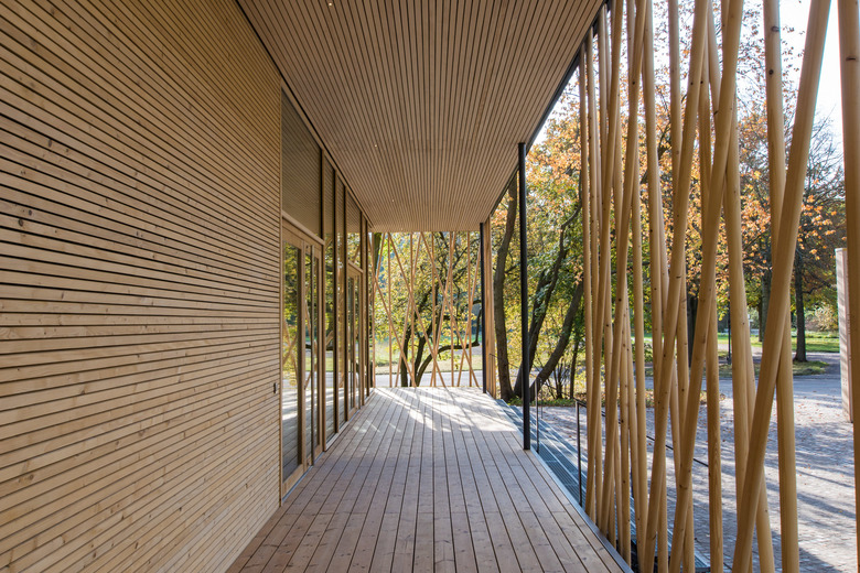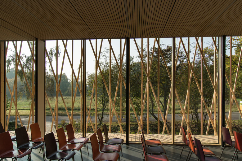 Das eingeschossige Bauwerk wurde als schwebender Pavillon im alten Baumbestand konzipiert. Während sich der nördliche Teil des Gebäudes als geschlossener Büro- und Infrastrukturblock nach innen orientiert, öffnen sich der Ausstellungsbereich und ein teilbarer Seminarraum durch bodentiefen Glasfenster nach Südwesten zum Park. Dieser Kernstruktur ist eine umlaufende Raumschicht vorgelagert, die durch ein filigran geflochtenes Band aus Rundhölzern gefasst wird, um Licht und Blicke zu filtern.