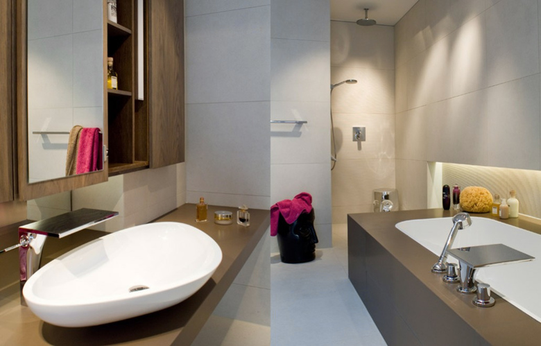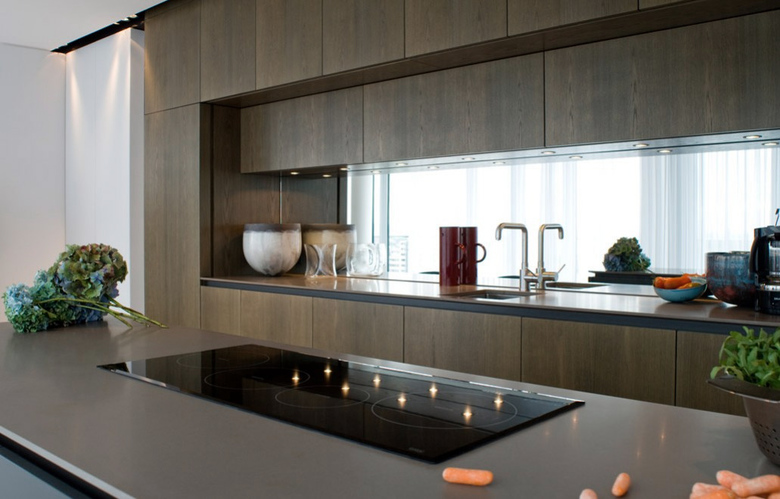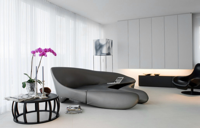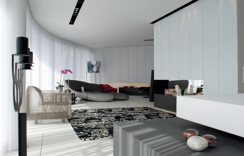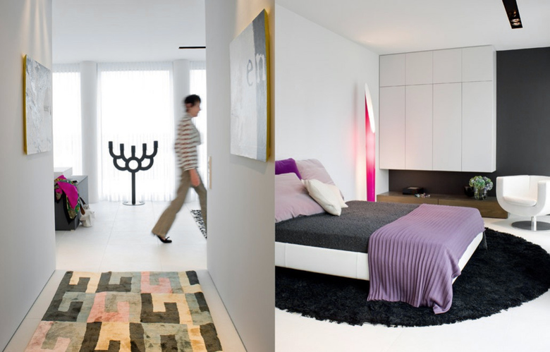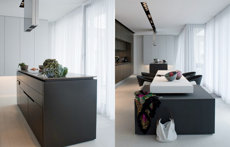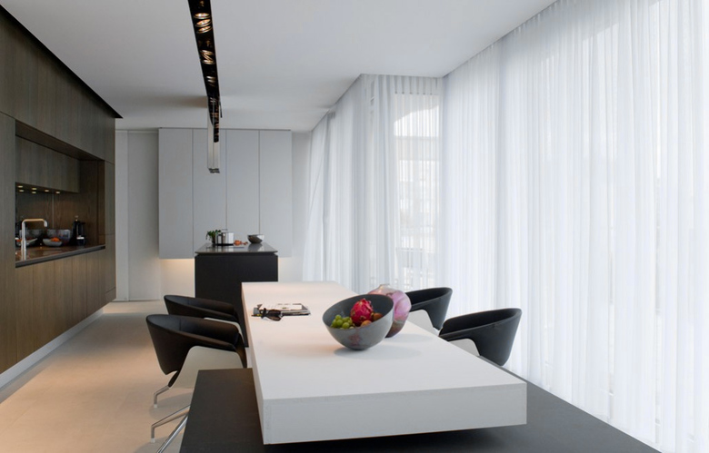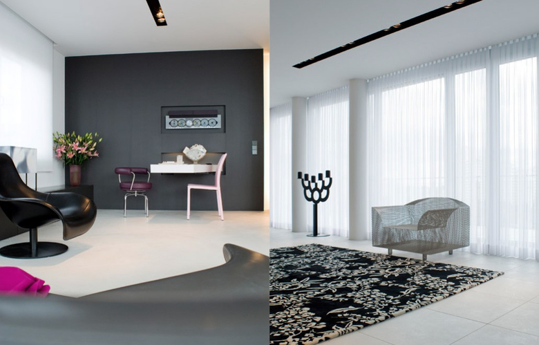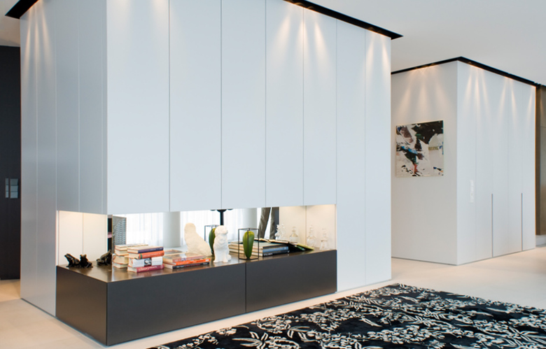 Dieses High-End-Penthouse ermöglicht einen atemberaubenden Blick über ganz Frankfurt. Die Wohnung wurde ganz in Weiß, mit wenigen Kontrasten in graphitgrau und grauer Eiche entworfen. Fast alles versteckt sich hinter eingebauten Türen. Das Konzept war einen fließenden "Weißen Raum" zu erstellen, mit mehreren Bereichen, die abgetrennt oder verbunden werden können. Vier speziell entwickelte Ankleideräume schaffen den notwendigen Platz, die umfangreiche Sammlung von Kleidern der Besitzerin aufzunehmen. Der Grundriss der Wohnung ist offen und fließend. Die gesamte Glasfassade ist von dem riesigen Wohn-und Essbereich aus sichtbar. Der Esstisch bildet zusammen mit dem Koch-Block ein skulpturales Objekt und wurde in der Mitte der Küchenzone platziert. Die Küche wurde als hängender Rahmen in den weißen Kern der Wohnung integriert. Das Schlafzimmer folgt dem gleichen Farbkonzept, mit ein paar zusätzlichen Farbakzenten in lila und violett. Das Bad passt mit seinem grau-braunen Stein perfekt in das ruhige und unverwechselbare Konzept, analog zu der grau getönten Eiche der Sideboards und der Küche. Beleuchtete Wände und indirekt beleuchtete Nischen schaffen einen großzügigen und extravaganten Look.
