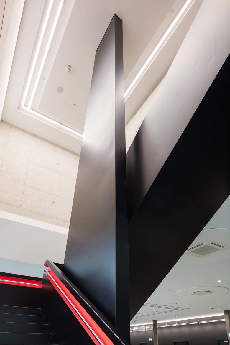 Der Besucher betritt das Gebäude über den zum Vorplatz ausgerichteten Eingangsbereich, der im Inneren den Stadtraum als stützenfreie Raumfolge fortführt. Vorbei an Ticketschalter und Fanshop gelangt man vom Foyer aus über eine Rolltreppe in das obere Niveau, welches auf zwei Ebenen die Dauerausstellung aufnimmt. Die sogenannte „Arena“ im Untergeschoss dient für Wechselausstellungen und Veranstaltungen, entsprechend ist dort die Gastronomie angebunden.