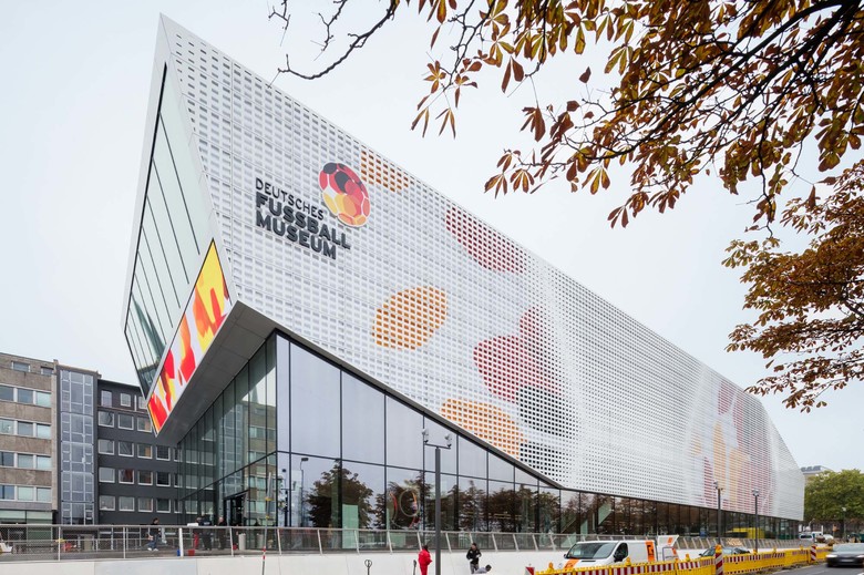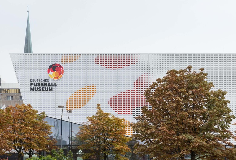 Dass es sich um den Ort des beliebtesten deutschen Sports handelt, kommuniziert auch die Fassade des Neubaus. Das Thema Fußball wird über eine perforierte, LED-hinterleuchtete Leichtmetallfassade abgebildet: Die rechteckigen Stanzungen verdichten sich zum Motiv des klassischen Fußballs. Der Fassadenzwischenraum wird durch austauschbare Bannergrafiken bespielt. An der Stirnseite vervollständigt eine LED-Medienfassade die erlebnisorientierte Außenwirkung des Bauwerks.
