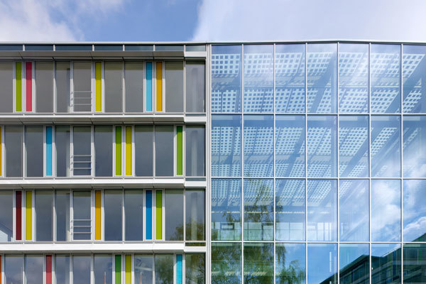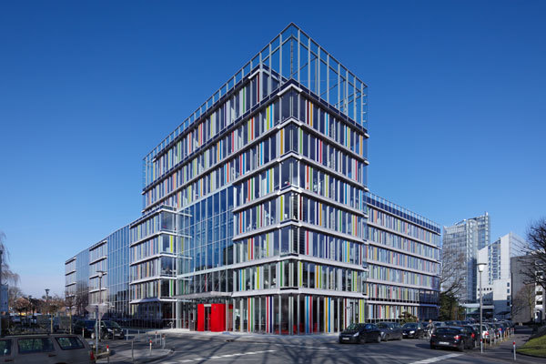 In unmittelbarer Nähe seines Stammsitzes hat der LVM seinen siebten Erweiterungsneubau errichtet. In Form eines wechselständigen Kammsystems wurden filigrane Glaskuben realisiert, die durch eine gläserne Magistrale verbunden sind. Neben seiner prägnanten, farbig gestalteten Hülle zeichnet sich das 3- bis 8-geschossige Gebäude durch sein innovatives Energiekonzept aus, das neben öffenbaren Fenstern ein Erdsondenfeld zur geothermischen Nutzung sowie eine Photovoltaikanlage beinhaltet.