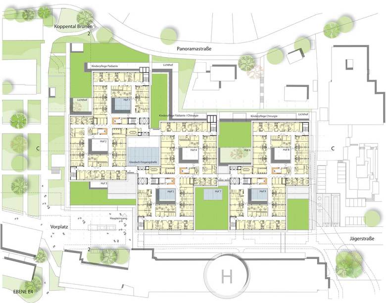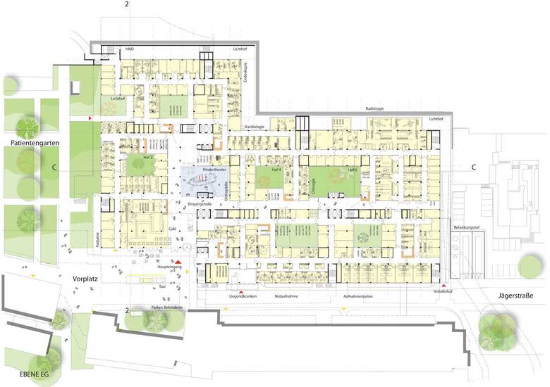 Die als quadratische Pavillonbauten angelegten Patientenbereiche liegen auf einem gemeinsamen, mehrgeschossigen Funktionsbau. Die Sockelgeschosse beherbergen die funktionalen Bereiche wie Empfang, Notaufnahme, Untersuchungsräume, Operationssäle, Labore, Physiotherapie, Personalräume und Konferenzbereiche. Über eine Magistrale in den drei Funktionsgeschossen werden die einzelnen Pavillons erschlossen. Ein Vorteil dieses Prinzips ist insbesondere die durch die Lichthöfe ermöglichte natürliche Belichtung.