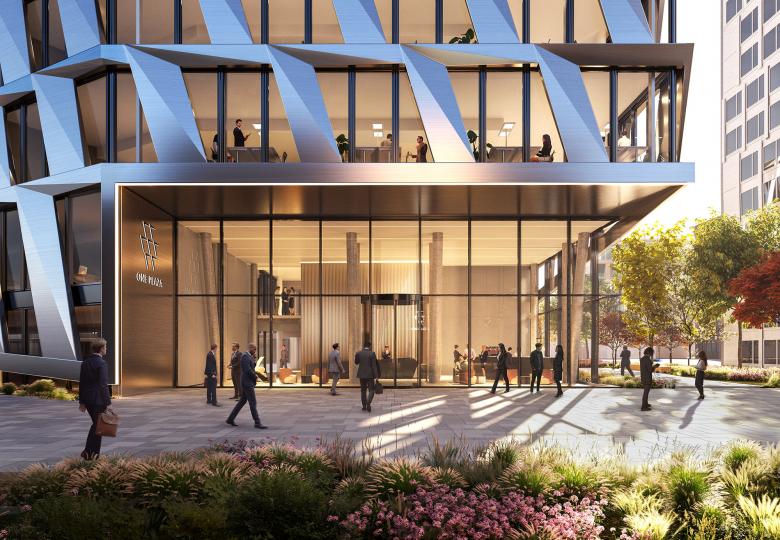 Die zweigeschossige Anhebung der Gebäudeecken öffnet das ONE PLAZA zu allen Seiten. Es ergeben sich drei großzügige Eingangssituationen, welche die Erdgeschosszone mit dem Quartier vernetzen. Gleichzeitig entsteht durch den Höhenversatz im oberen Fassadenbereich eine spannungsvoll geformte Dachlandschaft mit windgeschützten Gärten für die Büromieter. „Die schräg zulaufende Vorhangfassade mit ihren vertikalen, geschickt gefalteten Aluminium-Paneelen unterstützt die Dynamik und Leichtigkeit des Gesamtgebäudes und erzeugt ein spannungsvolles Spiel aus Licht und Schatten“, erläutert Volker Weuthen, projektverantwortlicher HPP Senior Partner.