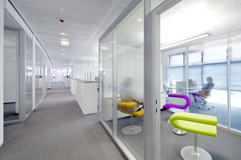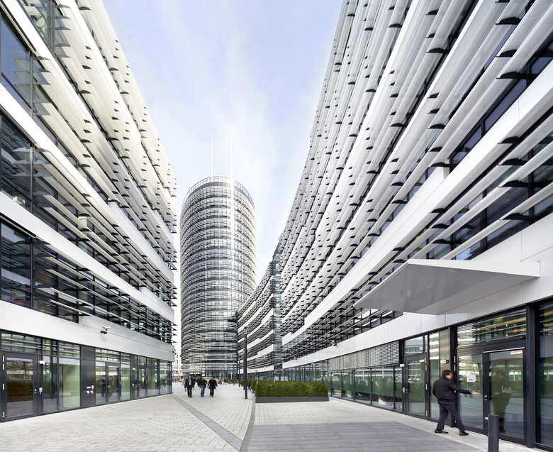 In Verbindung mit dem angrenzenden, radial gebogenen Gebäuderiegel folgt das 19-stöckige Hochhaus dem Verlauf der nahe gelegenen Schnellstraße und bildet das Rückgrat des Ensembles. Das prägende Merkmal sind die horizontal gegliederten Fassaden mit außen liegenden, unterschiedlich ausgerichteten Verschattungselementen aus weißen, gelochten Aluminiumblechen, die als Ausdruck der Corporate Identity des Unternehmens den Eindruck von Schnelligkeit und Dynamik vermitteln. Hinter diesem den Komplex zur Straße abschirmenden Gebäuderiegel öffnet sich als Mittelpunkt des Ensembles ein großzügiger Platz, der auf beiden Längsseiten von einer 7- bis 9-geschossigen Randbebauung eingefasst wird. Die Büroriegel verfügen über eine Gebäudetiefe von etwa 20 Metern, was eine flexible, modulare Aufteilung der offenen kommunikativen Raumstrukturen erlaubt. Der Campus weist mit einem zum Platz hin ausgerichteten Restaurant und einer neuen Freiraumgestaltung mit direktem Zugang für die Öffentlichkeit auch urbane Qualitäten auf, die ebenfalls zur Identifikation der Mitarbeiter mit Vodafone beitragen.