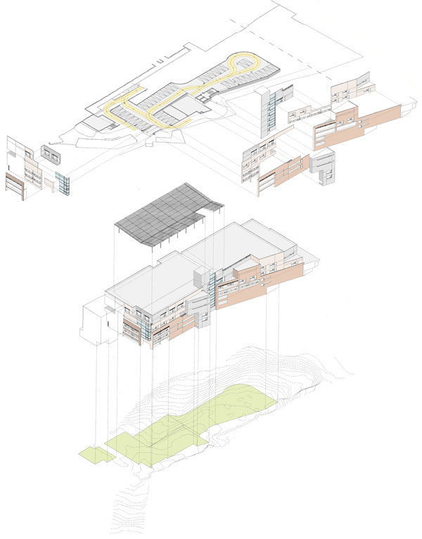 8. ISKCON FOLK CENTRE is a teaching facility with a parking garage situated on a heavily contoured site. The parking garage is tucked under the teaching facility and accessed separately from the lowest level.