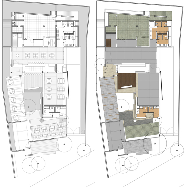 Having just returned from Venice when we began work on this 10,000 sft. restaurant, we made many references to Carlo Scarpa's work - especially the garden of the Querini Stampalia. We were keen to create a place that had the same sense of scale and attention to detail; the same play of rough and smooth, shiny and dull and an ambiguous distinction between inside and outside. Junctions between materials, geometries, etc. were also carefully considered.