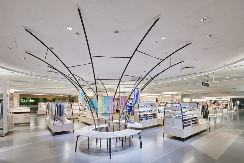 Yokohama SOGO B1 redesigned. The theme of “Genuine Oriented” = unadorned plain beauty, natural yet tidy space was considered. As an icon of the spacious sales floor, curved ironwork inspired by the wind and waves of Yokohama was placed at the center of the space. The fixtures are based on the grain of bright Japanese coniferous wood, with the colors gradually changing to natural, white-dyed, and gray-toned depending on the sales floor.