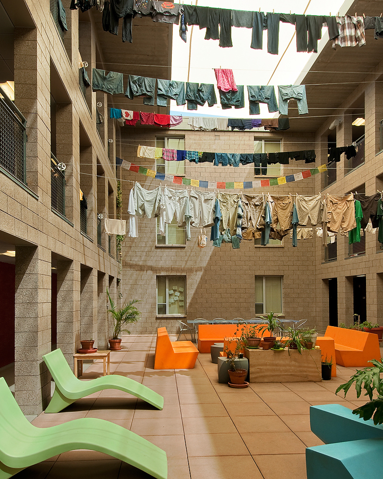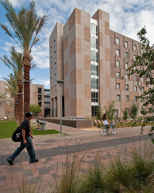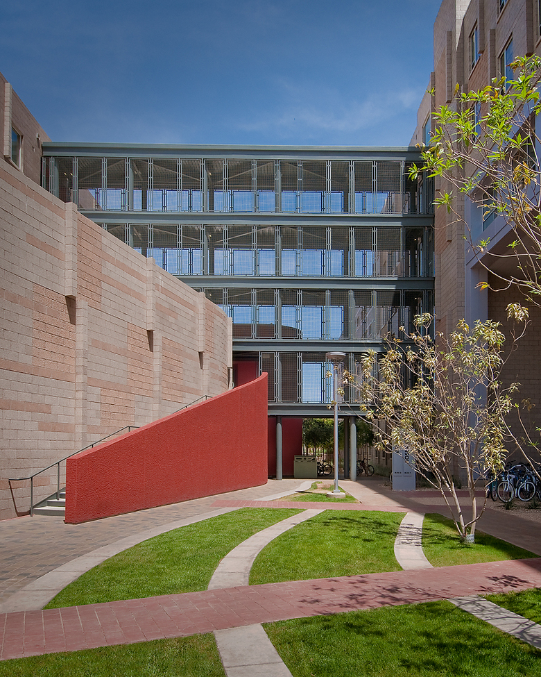 In the tradition of great residential colleges, Barrett is a network of interconnected, landscaped courtyards each with its own character and purpose. Beginning with the Palm Court, a public statement of Barrett’s openness to the entire ASU community, the courtyards proceed from the more formal Academic Court to the large, casual College Court, to the more intimate residential courtyards with a small amphitheater, outdoor classrooms and a sand volleyball court. At the heart of the college, at the College Court, the serpentine Dining and Community Center activate the life of the College with a canopy-shaded dining terrace overlooking the largest outdoor court, where most common activities occur.
