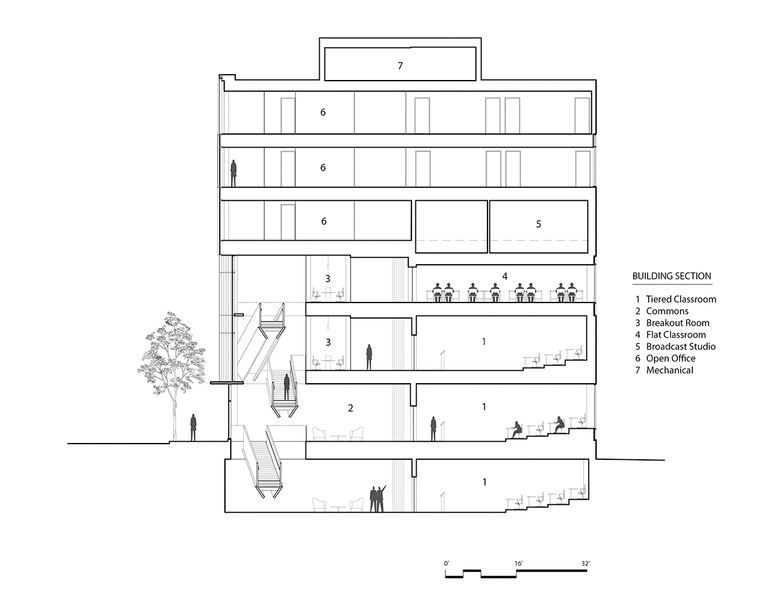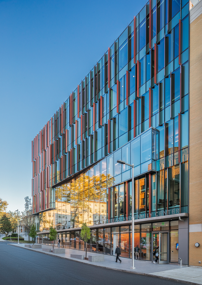 The Breazzano Family Center is distinctly modern in its approach. The building façade is a combination of clear and patterned glass with a rhythmic arrangement of angled and straight projecting mullion-fins, colored compatibly with the salmon-orange brick of its neighbors. The transparency of the ground floor and the active learning commons, highlighted by an undulating feature wall of wood slats and video screens, embraces Dryden Road. The variegated patterns of the facades serve to reduce the scale of the building, and the setback upper floors along Linden Avenue are rendered in dark metal to differentiate upper from lower and facilitate a relationship with the smaller scale of adjacent buildings.