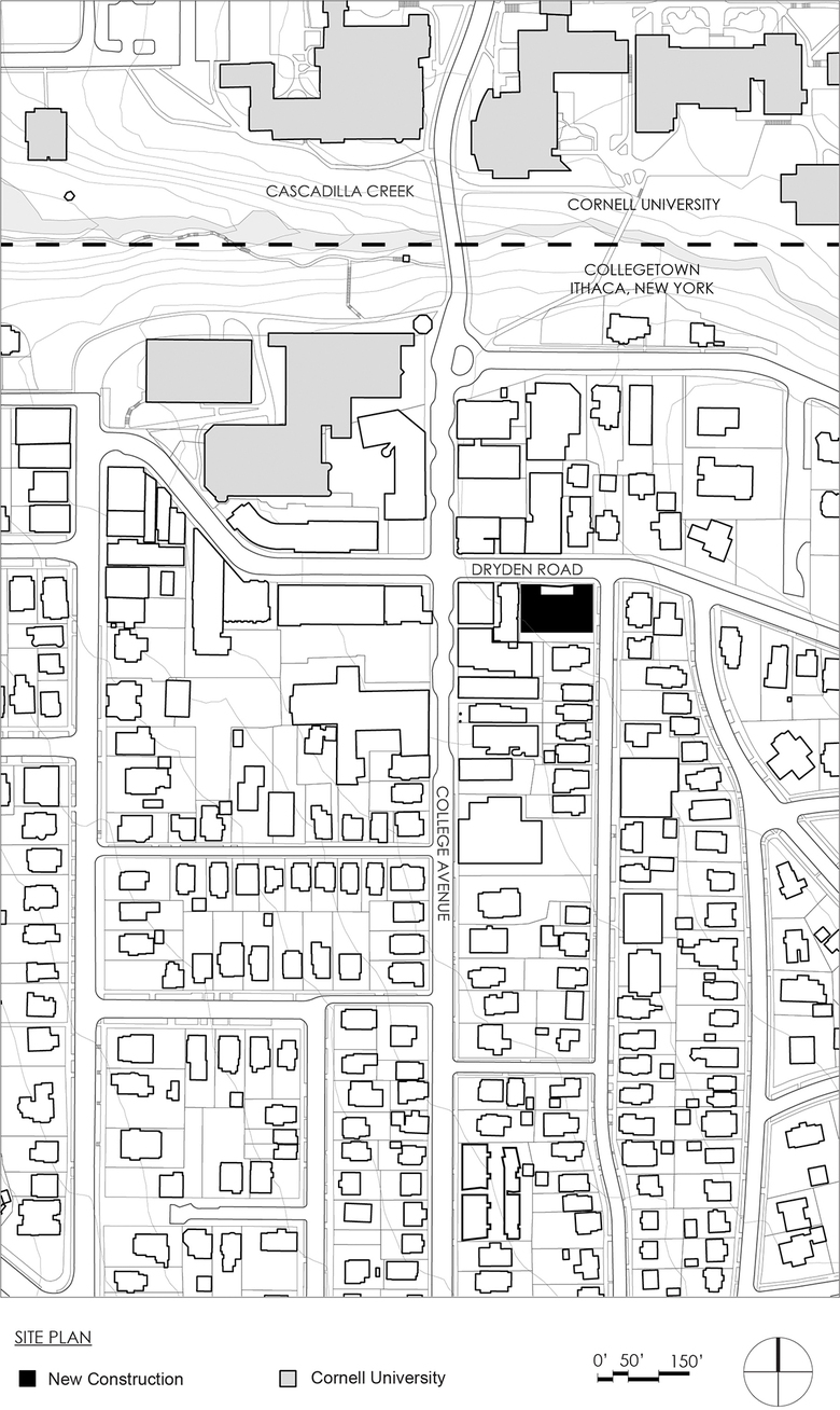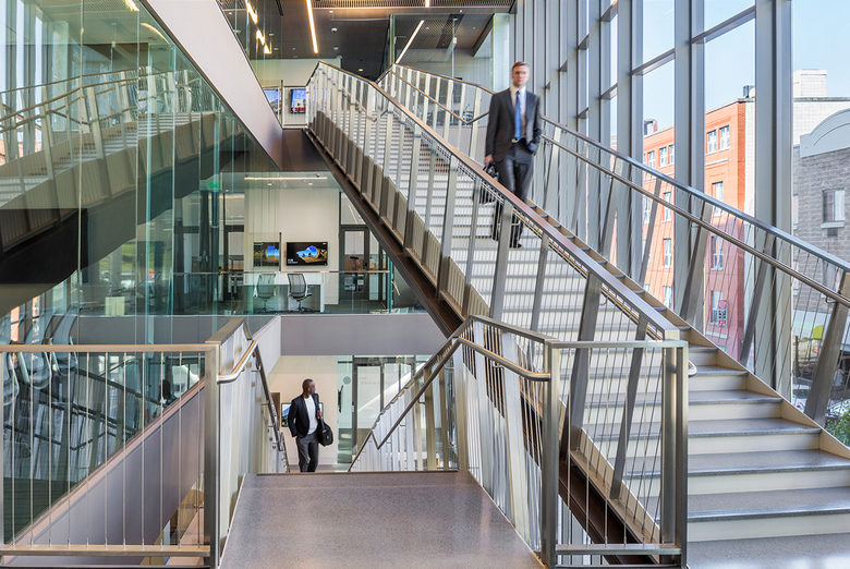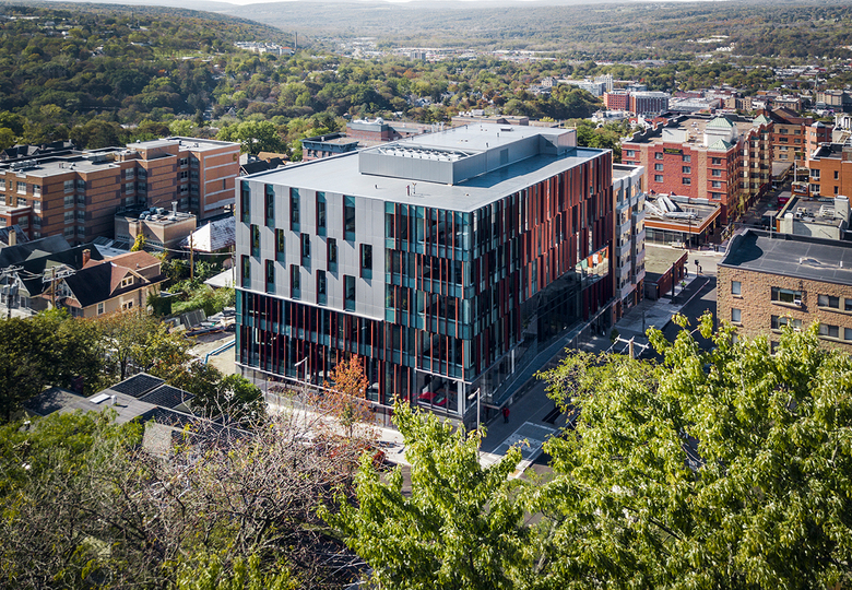 Located in the Collegetown section of Ithaca, New York, one block from Cornell’s main campus, the Breazzano Family Center for Business Education is a seven-story, 76,000-square-foot, twenty-first-century teaching and learning environment, and the first academic building to be built on this burgeoning precinct of the Cornell campus. State-of-the-art classrooms are supported by breakout rooms, faculty and student offices, social spaces, and a four-story atrium commons designed to accommodate a wide variety of events. The Breazzano Family Center’s top three floors provide enclosed offices for faculty and administrators, open office workstations, conference rooms and team rooms, and two broadcasting studios that transmit lectures and seminars to students in the Cornell Executive MBA Americas program.