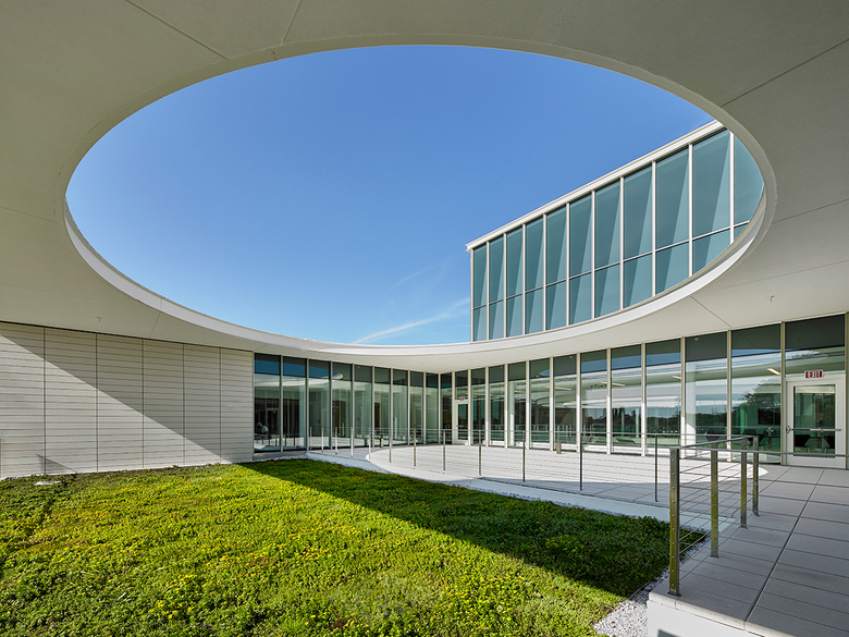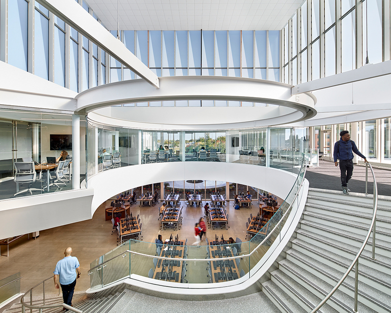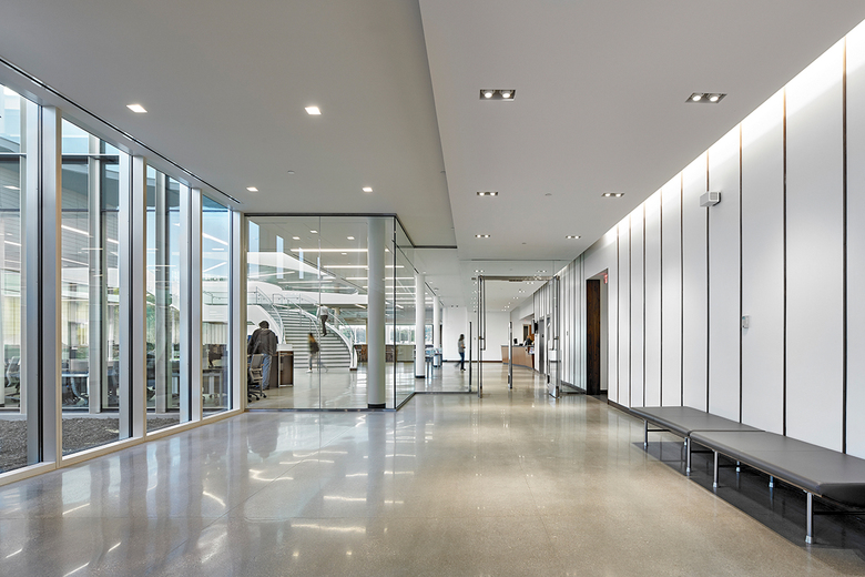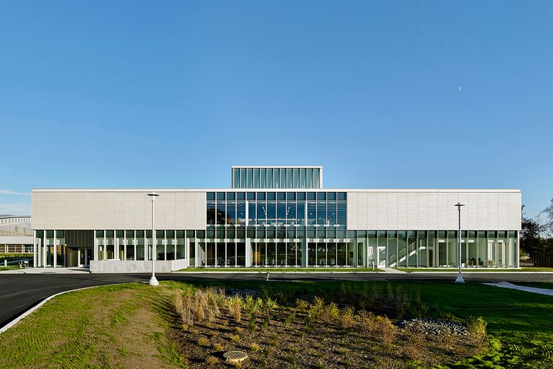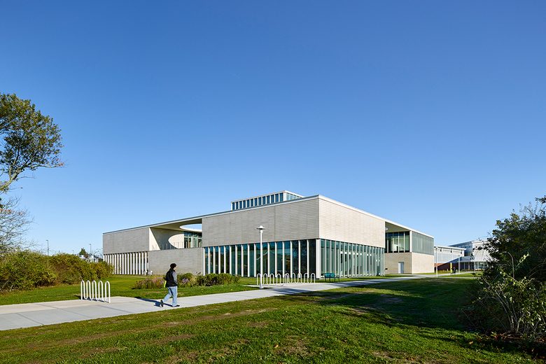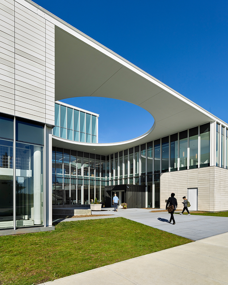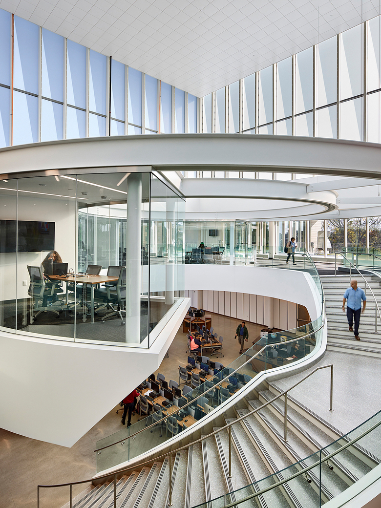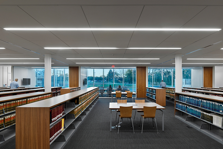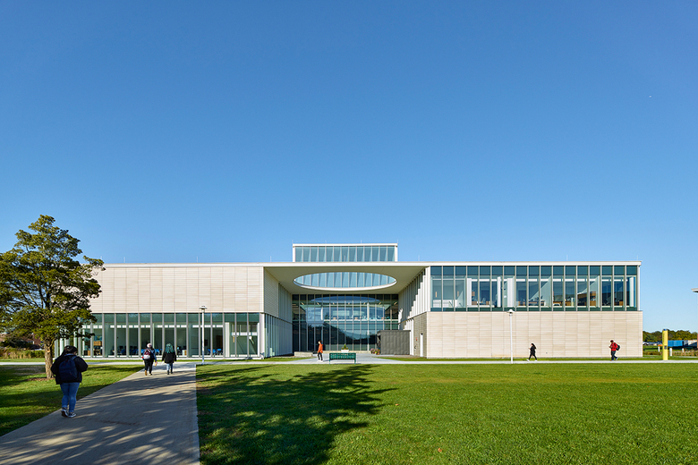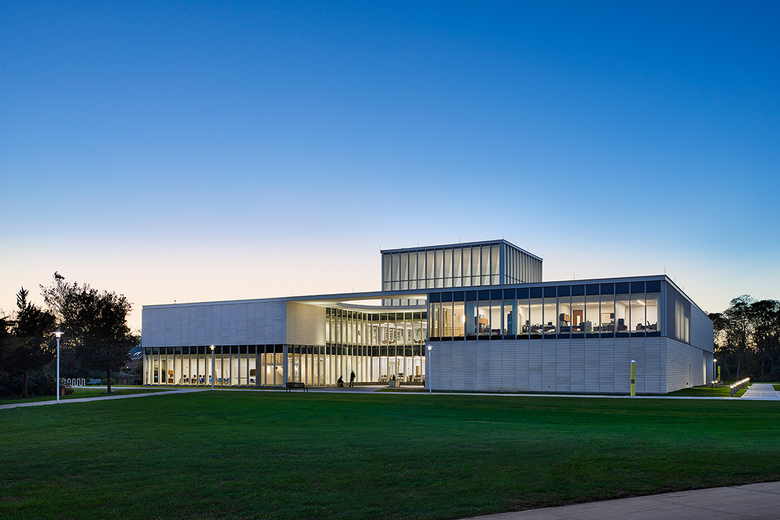 The building enclosure consists of an aluminum and glass curtainwall and white terra cotta, a departure from the red clay brick typically found on campus, to express the primacy of this learning center. A ventilated rain screen façade, green roof, and photo optic lighting controls are a few design features that incorporate a sustainable approach.